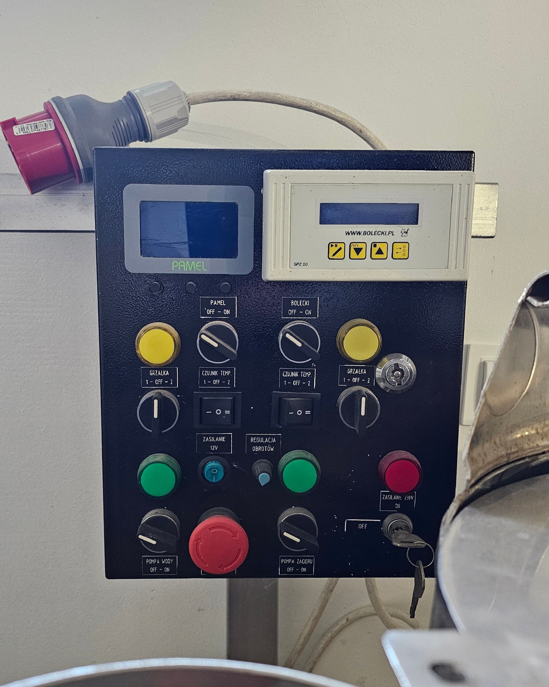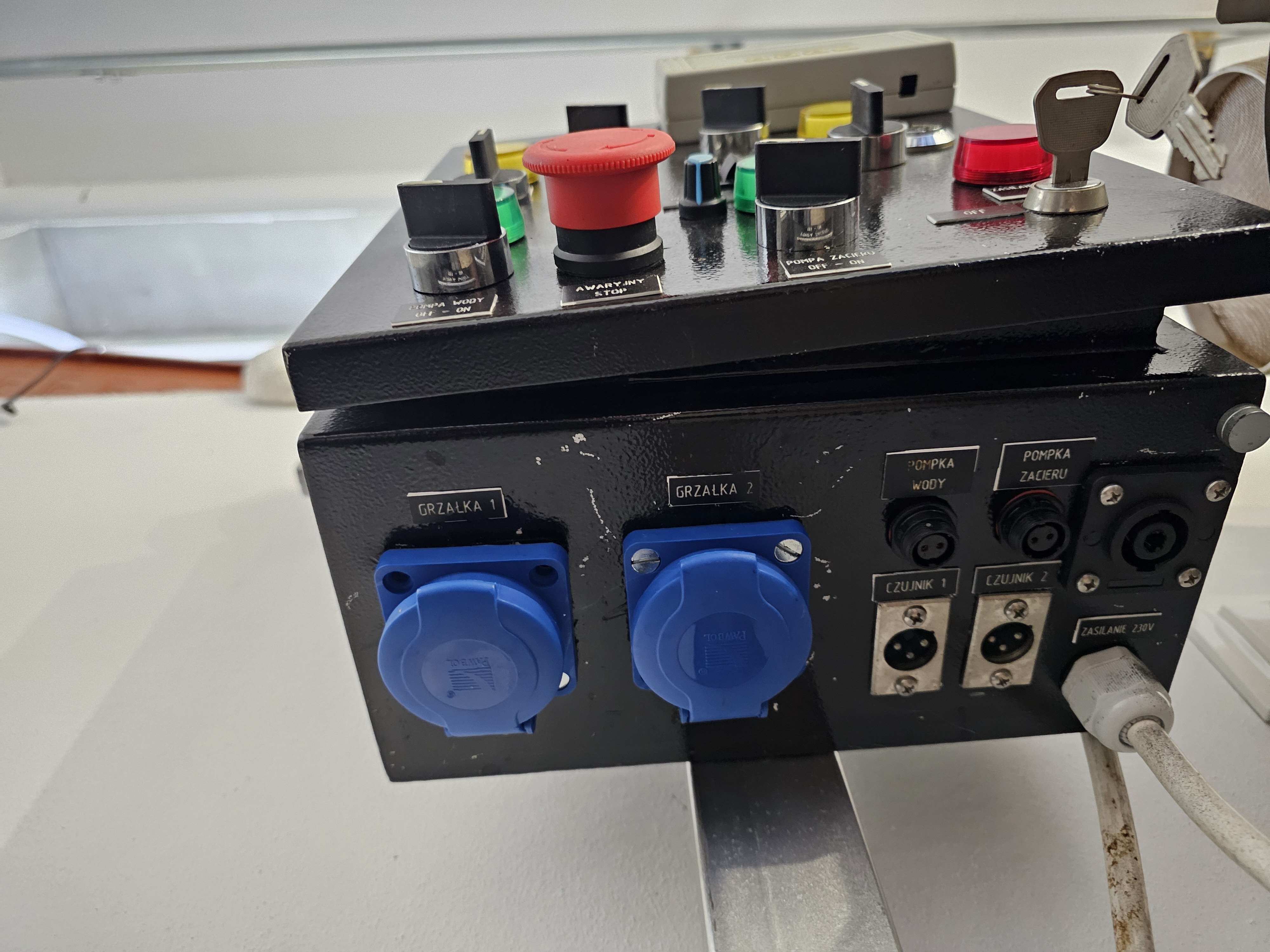 - Sterownik - własnej konstrukcji, oparty na Boleckim oraz Pamel PRM+ jako backup - oba mogą pracować jednocześnie, sterownik umożliwia przełączanie wpiętych grzałek i czujników w takiej konfiguracji jakiej chcemy aby były dostępne dla sterowników Bolecki albo Pamel, dodatkowo może współpracować z mieszadłami sterowanymi 12V wraz z regulacją obrotów, możliwość sterowania pompkami, włącznik kluczykowy oraz grzyb wybicia awaryjnego.