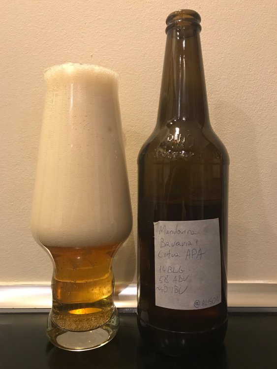 Alison - Mandarina Bavaria + Citra Pale Ale 14 blg 40 IBU 58 ABV Etykieta naklejana z nazwą piwa i parametrami końcowymi. Brak info o datach warzenia i rozlewu oraz składzie. Aromat: Lekko słodowe (bardzo kojarzące mi się ze słodem pilzneńskiem - był użyty?), brak chmielowych aromatów. Wygląd: Bardzo wysoka piana, jasna, drobno i średniopęcherzykowa, wysoka, bo piwo mocno przegazowane. Barwa - piwo ciemno złote, bardzo klarowne - bardzo mi się podoba. Bardzo ładnie prezentuje się w szkle (oczywiście jak juz trochę opadnie piana ;)) Smak: Piwo lekko kwaskowe - zakładam, że od Citry. Bardzo odpowiada mi goryczka. Goryczka średnio wysoka do wysokiej, niezalegająca, przyjemna. Tutaj też pojawia się charakterystyczny posmak słodu pilzeńskiego - ale nie jest to pilsowy diacetyl. Podsumowanie: Piwo bardzo przyjemnie się pije. Szkoda tylko wysycenia (przeszkadzało tylko na początku) ale reszta bardzo fajna. Z wielką przyjemnością wypiłem do końca. W butelce zostało niewiele osadu, więc zakładam, że było na cichej ale chyba bez dochmielania? Gratulacje uwarzenia i dzięki za możliwość spróbowania.