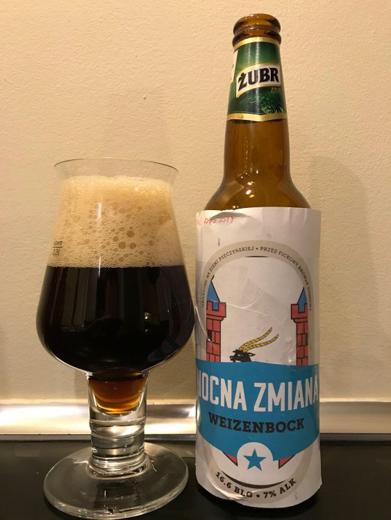 Fickowy Browar Domowy - Nocna Zmiana - Weizenbock 16,6 blg 7% Etykieta drukowana, za duża. Brak info o składzie. Data warzenia: 10-10-2017 Aromat: kwaśny chlebowy, utleniony Wygląd: Klarowne, ciemnobrunatne. Wysoka piana bo piwo mocno przegazowane, tuż po otwarciu chciało wyjść Smak: dominują posmaki utlenione i chlebowe. Generalnie chyba trochę taki nudny styl więc nie ma co pisać Dzięki za możliwość spróbowania.