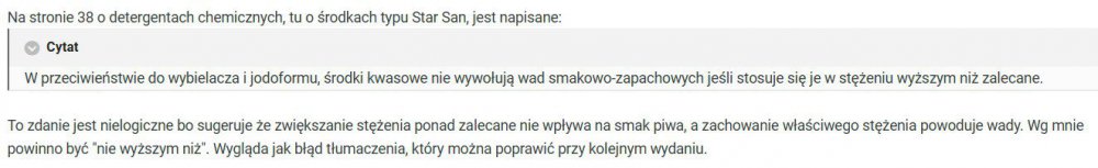 W oryginale jest: Unlike bleach and iodophor, acid sanitizers will not cause off-flavors at higher-than-recommended concentrations. Tłumaczenie jest dobre i myślę, że wszyscy właściwie to rozumieją. Ale OK. Może dodanie "nawet" byłoby precyzyjniejsze: W przeciwieństwie do wybielacza i jodoformu, środki kwasowe nie wywołują wad smakowo-zapachowych NAWET jeśli stosuje się je w stężeniu wyższym niż zalecane. -