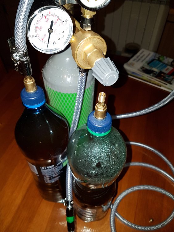 7. Wiadomo że lenistwo przy rozlewie daje złe rezultaty. Pisałem o pięciolitrowych szklanych gąsiorkach w kontekście testowej mini warki. Plastikowe butelki 1,5 L mogę być czasem pomocne przy testach z wysyceniem. Wystarczy kupić mosiężne zaworki samochodowe, końcówkę do pompowania na wężyk i gotowe. Przyda się też czasami przy rozlewie do butelek, gdy zostaje niewielka ilość która jest na normalną butelkę 0,5 za mała, wtedy przelewam do małej plastikowej, zakręcam zakrętką z zaworkiem i mam szybką próbkę nagazowanego piwa.