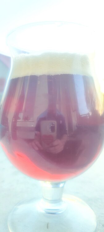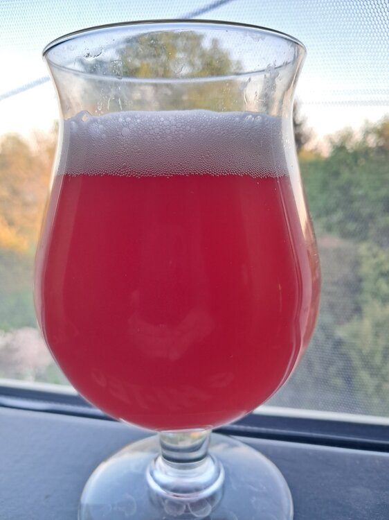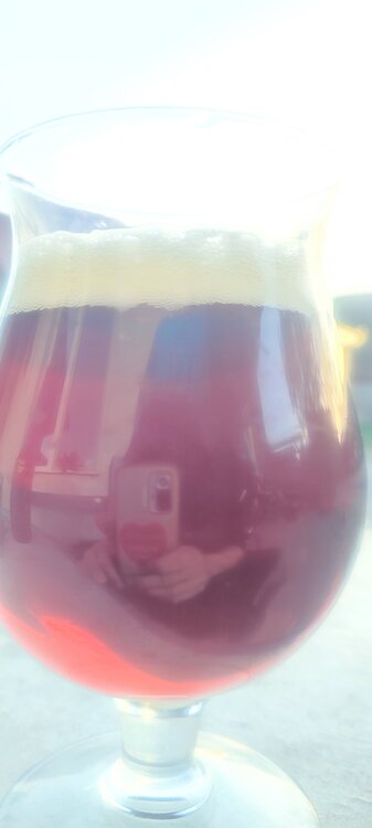 Warka 177 12,04,2025r. Berliner Weisse z Wiśnią i Porzeczką 40l 9,5blg 7 IBU - pilzneński 4,0kg - pszeniczny 3,5kg + Marynka 10g * WildBrew Philly Sour Gęstwa z warki 175. Całość podzielona na pół i dodana do dzisiejszych dwóch wiader Najprawdopodobniej ostatnia warka w sezonie. Dwie małe gęstwy w lodówce są, jakieś 5-7kg słodu też, więc jeśli będzie trzeba to może coś jeszcze powstanie. Ale posprzątałem i pomyłem porządnie wszystkie przybory także zamierzam już zakończyć sezon. Zrobiłem dziś tak, że jak zlałem warkę 175 na rozlew to połowę gęstwy zebrałem, połowę zostawiłem w wiadrze na te kilka godzin warzenia. Stało w piwnicy w ok 8-10°C. Nigdy tak nie robiłem, ale w sumie to tak samo jakby stało z piwem, więc chyba bez problemu. Zacieranie - 14l wody 68°C wsypałem słód. Podczas zacierania rozlewałem warki 175 i 176 stąd długie przerwy. Na spokojnie. 62°C/ 1h 40' 72°C/ 25' 78°C/ 10' i filtracja Filtracja - Sprawnie. Wiadro plus sprężyna. Raz mi się lekko przytkało i miałem dziś za mało wody do wysładzania. Musiałem pod koniec uzupełniać czajnikiem. W kotle ok 46l ok 8,5-9,0blg. Gotowanie - 60 minut średnio intensywnie. + Marynka 10g w 10' Schłodziłem całość do 18°C. Whirpool standardowo + zlewanie końcówki przez sitko. Stary spławik 9,5blg Nowy spławik 10,5blg Fermentacja - Napowietrzyłem zlewając i mieszając łygą. Zadałem drożdże i wstawiłem wiadro w ok 18-20°C. W 3-5 dniu fermentacji dodam po 1kg pulpy owocowej na wiadro. Mam wiśniową oraz czarną porzeczkę. 15,04 Dodałem po 1k pulpy owocowej na wiadro. 1kg wiśniowej i 1kg porzeczki czarnej. Porzeczka, była bardzo gęsta więc przepłukałem opakowanie ok 05-0,7l wody z butelki. 29,04 ROZLEW. Obie zeszły do 2,5 blg. Do wersji z wiśnią dałem 125g cukru rozrobione w ok 1,1l wody. Do wersji z porzeczką dałem 113g cukru rozrobione w ok 1,1l wody. Oba piwa celuję w 2,5 vol of CO2, bo były różne objętości. Łącznie obu wersji wyszło faktycznie 40L. Piwa refermentują w ok 20-22°C. Piwo robione na spółkę z kolegą. Rozlew dziś wspólny, więc super sprawnie poszło. 02,05 Schłodziłem obie wersje przez 1-2h w lodówce na pierwszą próbę. Smakują lepiej niż przy rozlewie, zapowiadają się dobrze. Jest już nawet niezłe wysycenie. Wersja z marakują jest bardziej kwaśna od obu tych dzisiejszych. Ciekawe czy ze względu na rodzaj pulpy czy pierwsze pokolenie drożdży. Pewnie obie te kwestie robią robotę. 11,05 Wersja z porzeczką. Wygląd - jak na zdjęciu. Mętny róż, ładna drobna piana na 1 palec. Aromat - jest kwaśność, w odróżnieniu od wersji z marakują tutaj mam wrażenie, że jest to bardziej kwaśność od drożdży a nie od pulpy. Czuć porzeczkę. W ciemno bym raczej powiedział, że to czerwona porzeczka. Bardzo dobrze pachnie. Lekko owocami, bardziej też zwykłym berlinerem. Smak - lekka słodycz, dalej kwaśność zaznaczona, ale po aromacie spodziewałem się jej więcej. Goryczka znikoma. Wysycenie jest delikatne. Piwo jest dość gładkie i trochę puste jeśli chodzi o teksturę, pełnię. W smaku trochę piwnego posmaku, kwaśność lekka i porzeczka. Im dalej w degustację tym porzeczka zaczęła mocniej wychodzić. Taki fajny posmak i już bardziej czuć, że to czarna porzeczka. Ogólnie - Piłem dziś też marakuję i ona jest bardziej kwaśna i ogólnie bardziej wyrazista. Porzeczka jest lżejsza, mniej kwaśna, mniej owocowa i taka mniej pełna, mniej piwnej podbudowy. Smakuje jakby to było rasowe 7,5 blg. Co jest też dużym plusem tego piwa. Ale wolałbym żeby taki smak był faktycznie przy rozcieńczeniu do 7,5blg, a tutaj to już prawie pod 10 podchodzi. Generalnie szału nie ma, ale jestem jak najbardziej zadowolony. 03.06.2025r. WERSJA Z PORZECZKĄ Ogólnie - wrażenia jak wyżej. Tym razem mam wrażenie trochę większej pełni tego piwa. Wcześniej miałem wrażenie, że wersja z porzeczką jest najbardziej wodnista. Jest tak, ale nie ma między wersjami dużej dysproporcji. Wysycenie nie wzrasta. Z jednej strony to dobrze, bo trochę się w tych piwach obawiałem przegazowania. Z drugiej strony to wysycenie jest nieco za niskie. Lepiej by orzeźwiało. 12,05 Wersja z Wiśnią. Wygląd - jak na zdjęciu z kapslem "wiśnia" Aromat - świeży, lekko kwaśny owocowy aromat. Jak wiem, że to wiśnia to ją czuję. W ciemno ktoś by pewnie krążył wokół wiśni, malin, czerwonej porzeczki. Smak - lekka słodycz, od razu wyraźna kwaśność, fajna zaznaczona, ale mordy nie wykrzywia. Jest super. Goryczka znikoma. W smaku piwo, podbudowa słodowa jest zaznaczona. No i wiśnia w smaku, czerwone owoce te co w aromacie. Nie jest puste. Dziwne bo to ta sama brzeczka. Trzeba będzie porównać bezpośrednio. Porzeczka była trochę pusta. Wiśni bliżej do wersji z marakują pod wzglądem pełni. Ogólnie - Przy rozlewie wiśnia rokowała najsłabiej. Jest najmniej wyrazista owocowo. Ale pozostałe aspekty są super. Kwaśność, rześkość, pijalność, to, że jest to piwo z sokiem a nie tylko soczek. Dla mnie 8,5/10 Jestem bardzo zadowolony z każdej wersji. Marakuja najlepsza. Porzeczka lepsza jeśli chodzi o owocowość, wiśnia lepsza jeśli chodzi o całokształt chyba. 06,08,2025r. Wygląd - jak na zdjęciu. Bąbelki lecą w zwolnionym nieco tempie. Aromat - jak wyżej. Bardzo przyjemny. Smak - jak wyżej. Ogólnie - generalnie ta warka jest najsłabsza, ale lekko tylko odstaje. A raczej odstawała. Problem polega na tym, że po pewnym czasie od rozlewu piwo zrobiło się gęste, lepkie, końcówka z butelki ciągnie się jak kisiel. Dzisiejszy egzemplarz i tak jest ok. Ciekawe czym to jest spowodowane.