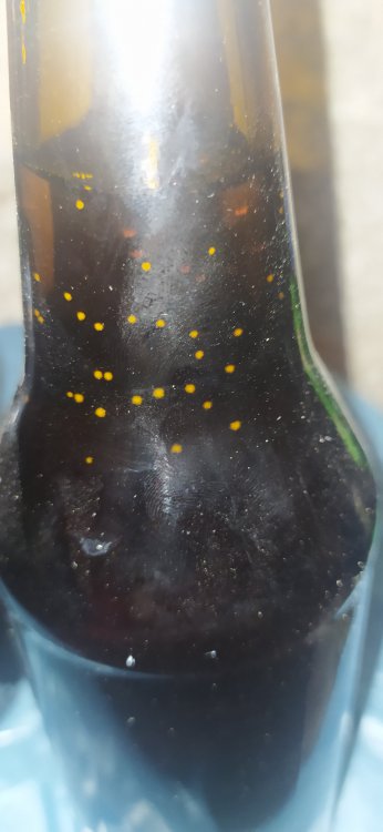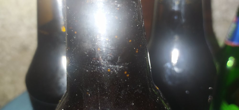 2. Tak to wygląda w pełnej butelce. Dodatkowo zauwzylem że takie "kropki" są też na powierzchni osadu drożdżowego na dnie butelki, ale to tego nie umiałem uchwycić na zdjęciu. W każdej butelce jest podobna sytuacja - w jednych mniej, w innych wiecej tego syfu. Nie wiem też czy wyraziłem się jasno w pierwszym poście - to coś jest jakby przyklejone od wewnętrznej strony szyjki.