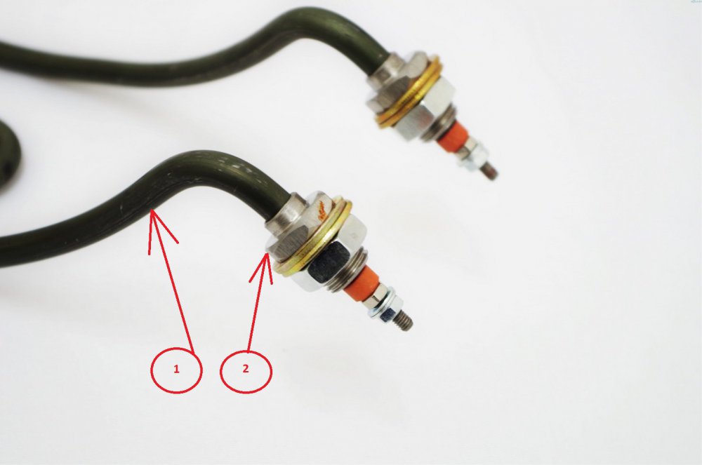 To jest super zdjęcie zaczerpnięte z egrzlki. Element grzejny (1) po czyszczeniu (trawieniu) będzie miał kolor podobny do mufy (2). Może w procesie produkcji samego elementu grzejnego (rurki z drutem oporowym) łapie to ten dziwny zielonkawy odcień. Grzałka od sprawka i te nadają się do czyszczenia, które może ma trochę mylną nazwę trawienie. I jeszcze jedna sprawa - zanim przykręcicie grzałkę do garnka/kega warto sprawdzić czy nakrętka jest nierdzewna czy tylko ocynkowana.