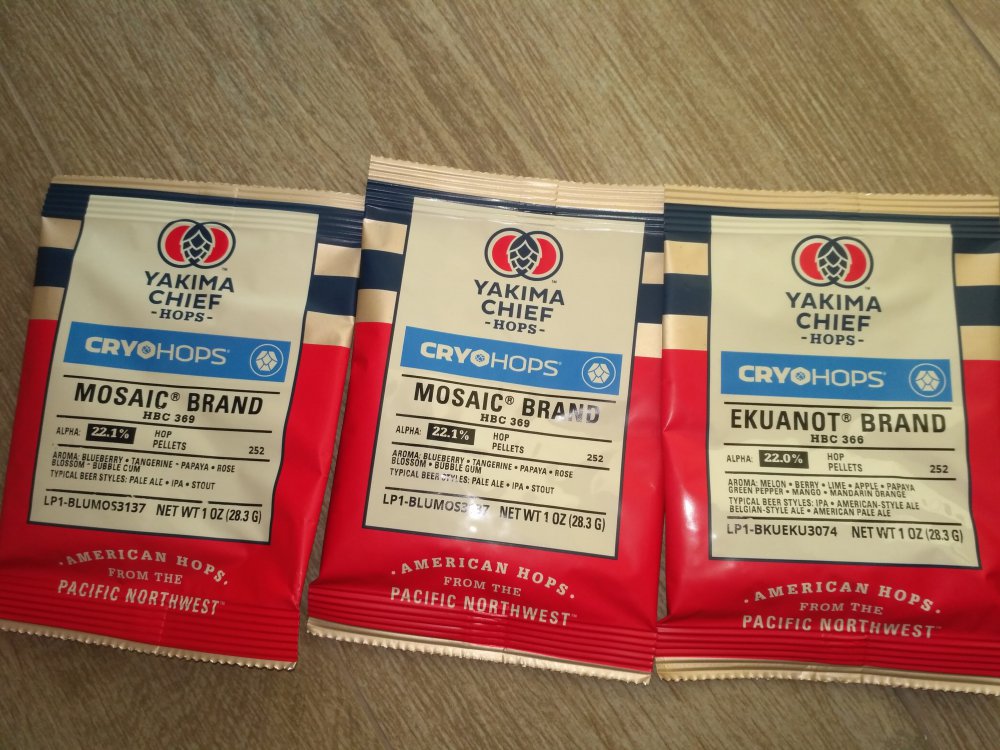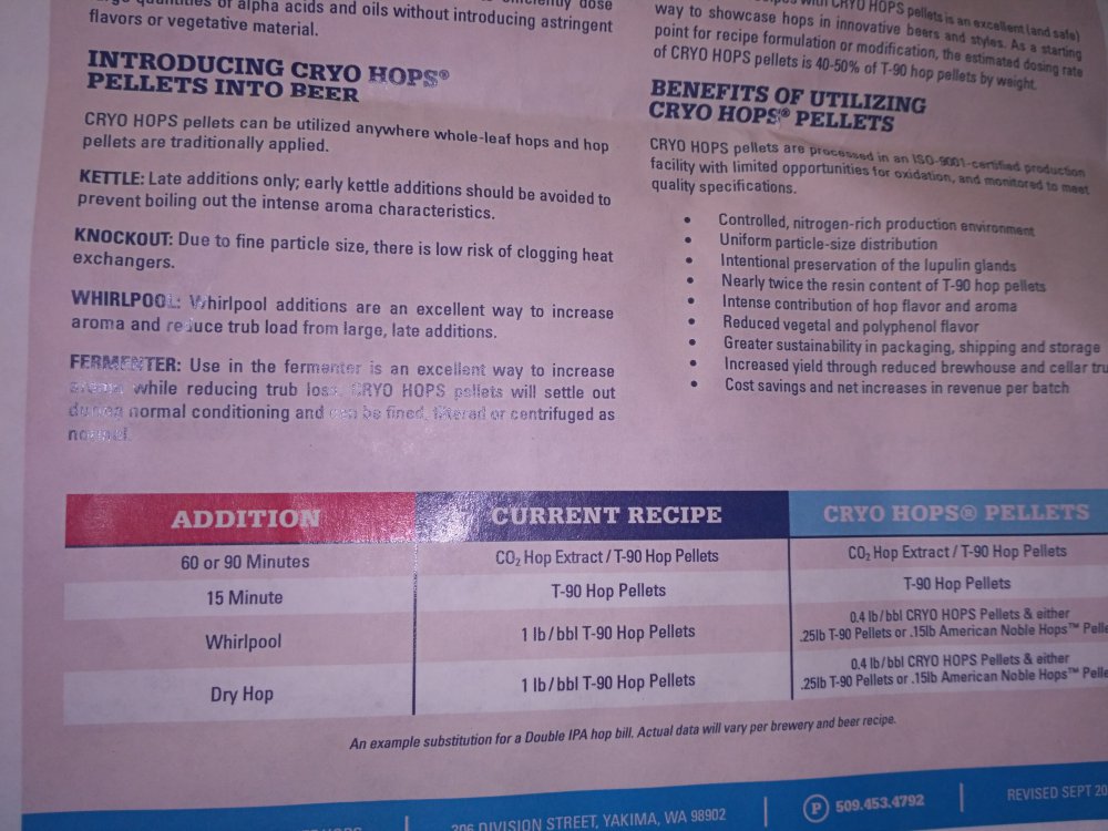 Przywiozłem z targów Brau Beviale próbki tych cryo hops mozaica equanota i jeszcze mam dużą pakę azzacca więc coś z tym będę warzył na ulotce piszą że na koniec gotowania lub na zimno. Na dole ulotki jest porównanie chmielenia wynika że zamiast 1 funta chmielu na whirpool dali 0,4 cryo 0,25 zwykłego granulatu i 0,15 American noble hops -
