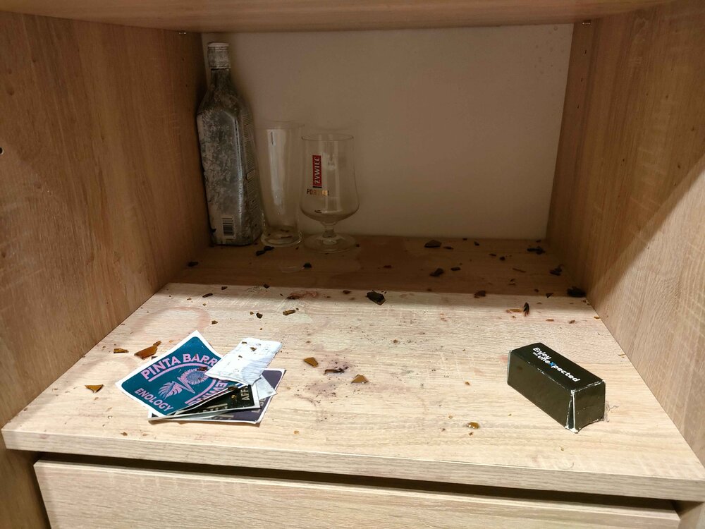 Tak odłamki wszędzie były, niżej do szuflad się dostały, nie umiałem otworzyć drzwi od szafy bo na szynie pełno szkieł było i haczyły o kółka xD jedna szklanka została stłuczona przez odłamki ale wszystkie inne butelki całe.