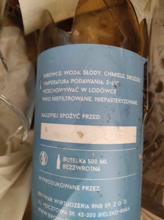 W załączniku etykieta. Piwo było już w lodówce i mi je z niej dali, nie nalewają przy kliencie tylko mają już zabutelkowane ale nie ma na żadnym daty, kupiłem 4 różne i nie ma dat więc nie mam pojęcia jakiej są świeżości. Co ciekawe teraz zauważyłem wgrywając zdjęcie że w składzie nie ma nic o borówkach. Przez telefon coś mi powiedział właściciel że tam je dodają ale nie pamiętam w jakiej formie, na pewno nie zest tylko jakiś koncentrat czy coś innego i w przypadku takich piw powinienem niezwłocznie trzymać w lodówce. A najlepsze że kelner który ze mną najpierw rozmawiał bo on pierwszy odebrał telefon mój że jemu w aucie się zdarzyło rozlać te piwo i tez traktuje to jako normalną sytuację. To chyba musze następnym razem z lodówką turystyczną przyjechać....