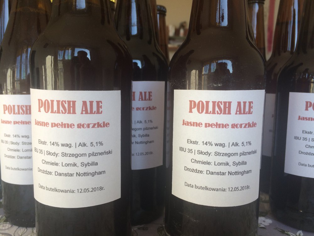 #7 Polish Ale W założeniu ma to być piwo wytrawne, mocniejsze. Po schłodzeniu brzeczki wyczuwalne dość mocne aromaty chmielowe, w smaku dość mocna goryczka. Jeśli zgodnie z założeniem odfermentuje głęboko to powinno wyjść dobre wytrawne piwo. Gęstwa z Danstarów zachowała się dobrze, zrobiłem starter litrowy z niechmielonej brzeczki. Słody: 3 kg Strzegom pilzneński Zacieranie: 60 min 60-62 °C 10 min w 72 °C wygrzew do 78 °C Chmielenie: 60 min Sybilla 5g 45 min Lomik 25g 30 min Lomik 10 g Drożdże: gęstwa z Danstar Nottingham z warki #6 Wyszło: 10,5 l o gęstości 14 Blg Według Brewness: 35 IBU, wydajność 70%, 4,2 SRM [edit] Miało być wytrawne według założeń, a wyszło pełne Muszę jeszcze popracować nad techniką. Zlane na cichą przy ok. 4 Blg, zostało już tak do końca. Po 21 dniach zabutelkowane z 32 g glukozy na ok. 9,5 l. Wyszło 19 butelek 0,5l. Bardzo klarowne już przy wlewaniu do butelek, w smaku trochę za bardzo czuć alkohol, poza tym goryczka wyraźna. Zobaczymy co z tego będzie. -
