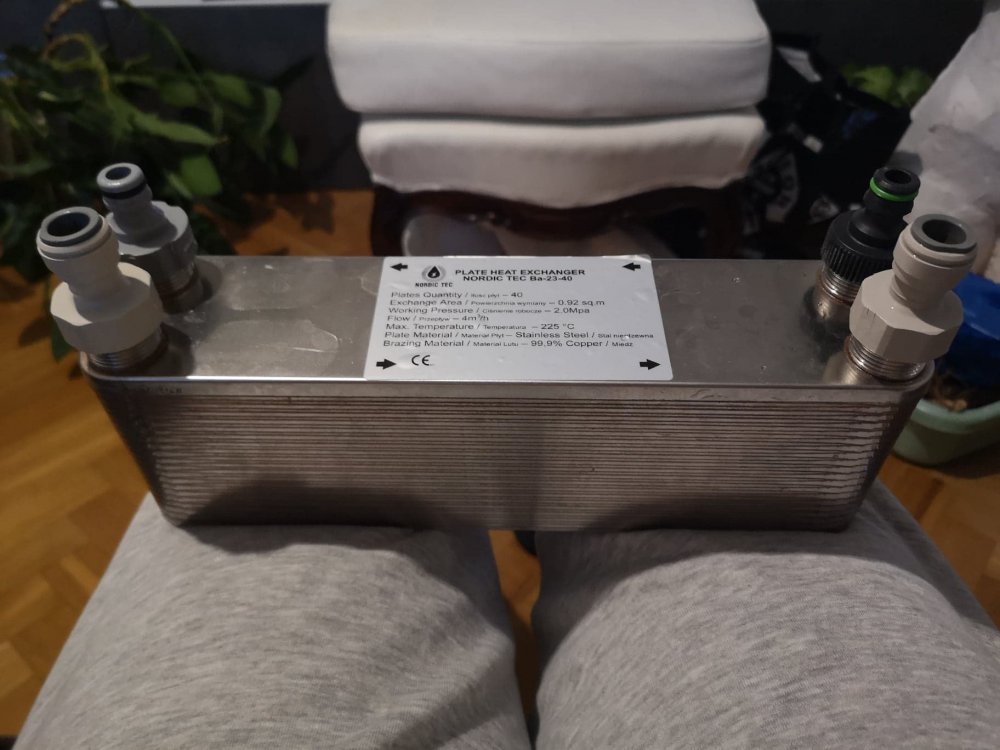 Cześć, Ostatnio zakupiłem wymiennik płytowy(zdjęcie poniżej), teraz rozkminiam jak po prawidłowo podłączyć do tego co posiadam. Warzę w kociołku automatycznym od hopcata, do wyboru jest zlanie przez kran grawitacyjnie lub wykorzystanie wbudowanej pompki. Na zakończeniu pompki nie mam żadnego gwintu więc prawdopodobnie jedynym bezpiecznym montażem jest podłączenie do kranu z wykorzystaniem opaski zaciskowej(zdjęcie poniżej). W wymienniku są złączki John Guest, 1. Jak podłączyć wymiennik do kociołka? W kociołku kran jest zakończony tak jak przedstawione jest to na zdjęciu poniżej - czy do tego można zakupić złączkę John Guest? Czy węże od john guest są prawidłowym materiałem do wykorzystania? Wszystkie które widziałem w sieci mają jako max temp 65 stopni czy coś polecacie w to miejsce czy się tym nie martwić? Rozumiem że wężyk wyjściowy brzeczki przez dziurkę na bulkadełko do docelowego fermentora 2. Czyszczenie wymiennika - przeglądałem forum i internety, poniżej to co znalazłem może wskażecie co najlepiej: podczas płukania zmienić bieg cieczy wtedy więcej farfocli wyleci zalanie NaOH na kilka minut zalanie oxi na kilka minut po umyciu zalanie spirytusem do czasu kolejnego warzenia (spirytus później zlany i ponownie wykorzystany w tym samym celu) i zakręcenie wszystkich wejść 3. pozostaje jeszcze temat napowietrzenia, ale o tym muszę jeszcze poczytać. Z góry dzięki wszystkim za zainteresowanie. Parametry wymiennika: ilość płyt 40 powierzchnia wymiany 0,92 m2