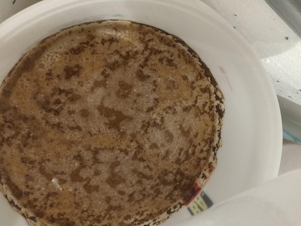 Poprzednio zle zapisalem druga dawke chmielu - mialo byc na 45 min gotowania czyli 15 min przed koncem nie na odwrot ahh dopiero rano kiedy jeszcze przegladalem notatki i recepture doczytalem w koncu poprawnie. Ok, kolejna warka za mna i kilka pytan: 1. Cos mi woda do wysladzania zle wyszla - wyliczylem ze potrzeba 14 litrow: 23 litry brzeczki na gotowanie - (14 litrow wody na start - 5 litrow z 5 kg slodow) = 14 litrow - zabraklo okolo 3 litrow ktore dogotowalem szybko czajnikiem z regulacja temperatury. Ale dziwne znowu mi to nie poszlo. Filtrowane przez sracz wezyk 100 cm, fermentor z kranem w ktorym bylo mloto byl wysoko na blacie a na ziemi fermentor do odbioru - nic sie nie przytykalo. W sumie filtracja zeszla mi lekko ponad godzine. Co ja tu nie tak moglem zrobic? Czy to wina tych 2.5 kg przenicy?? 2. Po wysladzaniu wyszlo mi 23 litry brzeczki 11.2 plato (1.045 SG) przy 29 stopniach C, gotowaniu i wychladzaniu dostalem 19.5 l brzeczki 13 plato (1.054 SG) przy 20 stopniach C. Wiec chyba nie zle - korzystalem tym razem z 1 pola 12-14 moc co daje 2100-2400 W, mialem jedynie problem przy utrzymaniu temperatury na poczatku kiedy wsypalem mloto do wody 69 stopni temp spadla do 65 i byla miedzy 70-67 stopni przez 60 min, odczyty miarodajne mialem zazwyczaj dopiero po dobrym wymieszaniu jak temp sie rozlozyla w calej brzeczce - mieszalem co 5-8 min i lekko podtrzymywalem temp - 4-6 mc czyli 500-800 W mocy indukcji. 3. Jako ze mam garnek z zaworem kulowym to pojawia sie problem na samym koncu kiedy przenosze piwo do fermentora i napowietrzam - przydal by sie jakis filtr zeby miec pewnosc ze nie pociagne chmielin tylko jak to zrobic? Cos na wcisk od srodka z siatki stalowej? Robilem niby wirowke na koniec ale nie wiem ile trzeba czekac, mimo wszystko i tak specyfika garnka jest taka ze zeby zlac wszystko musze przechylic go troche zeby poszlo wszystko w zawor ktory jest na pewnej wysokosci dlatego chmieliny i tak sie pchaja. Czy uzywac ponczochy czy sitatki czy hop sidera?? 4. Umylem garnek plynem do mycia naczyn dokladnie tak zeby byl czysty i po tym dalem ocet 10% na cale dno - lekko podgrzalem i caly nalot ktory byl na dnie zszedl ladnie (uzylem miekkiej szczotki do mycia z ikei), zastanawiam sie czy jeszcze robic czyszczenie NaOH 5% jutro - samego dna tak mysle 1 L wody by wystarczyl zeby ladnie przykryc dno. 5. Przy okazji otworzylem fermentor z warka z poprzedniego tygodnia - Grodziskie BLG 7 (wyszlo 6.5 koniec koncow) w kazdym razie chyba wyglada ze wszystko zdrowo jest w srodku - to moja pierwsza warka fermentowana na burzliwej bez kranika. Stala tydzien w temp 12 stopni. 6. I wazne pytanie dla mnie - jak pobieracie probke z fermentora bez kranika? Myslalem nad duza pipeta albo strzykawka 200 ml + desprej zeby wysterylizowac. Bo za tydzien chce sprawdzic to Grodziskie czy juz jest zjedzony ten cukier... -