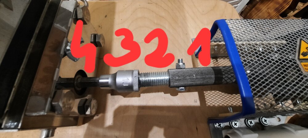 1. https://allegro.pl/oferta/kolumna-kierownicza-renault-clio-ii-8200091805-12107810660 to jest link do aukcji. Zobacz filmik od Sebastian Strzeliński na YT. Tam jest wszystko fajnie pokazane. Na zdjęciu: 1-to obcięta rura na zewnątrz wieloklin (komplet razem z silnikiem), 2-do środka włożyłem śrubę fi16mm, przewierciłem obie części (łatwo poszło dosyć miękkie materiały) i skręciłem śrubą. Śrubie obciołem łep i wyciołem z wałka kwadrat o wielkości wpustu w nasadce ( spasowałem dość ciasno). 3 - nasadka 10 na imbus. Imbus to wyjście z wałka gniotownika. Mam nadzieję że wszystko w miarę jasno opisałem.