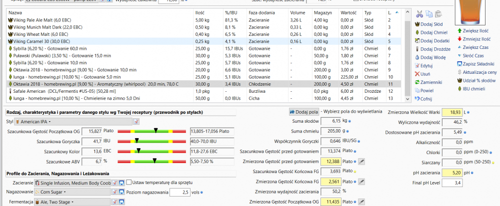 Cześć, chciałbym przedyskutować taką recepturę: Składniki 1,00 g chlorek wapnia 1,00 ml kwas mlekowy 4,00 kg CHÂTEAU PALE ALE (8,5 EBC) 71,4% 1,00 kg Viking Munich Malt Light (16,0 EBC) 17,9% 0,50 kg Caraaroma (400,0 EBC) 8,9% 0,05 kg Carafa I (800,0 EBC) 0,9% 0,05 kg Viking Wheat Malt (6,0 EBC) 0,9% (dla wzmocnienia piany) Chmielenie: 5,00 g Citra [12,00 %] - Gotowanie 60,0 min 6,4 IBU 10,00 g Citra [12,00 %] - Gotowanie 0,0 min 5,4 IBU 10,00 g Mosaic (HBC 369) [10,40 %] - Gotowanie 0,0 min Chmiel 12 4,7 IBU 40,00 g Mosaic (HBC 369) [10,40 %] - whirlpool Chmiel 13 4,2 IBU 35,00 g Citra [12,00 %] - whirlpool 20,0 min, 7… Chmiel 14 4,2 IBU 3,00 g mech irlandzki (Gotowanie 10,0 min) US-05 lub Nottinghamy do pierwszego fermentora, S-04 do drugiego. Fermentacja w temp otoczenia 13st celcjusza Est Original Gravity: 14,475 Plato Est Final Gravity: 3,364 Plato (przy US-05) Estimated Alcohol by Vol: 6,1 % Bitterness: 24,8 IBU Est Color: 45,0 EBC Zacieranie Single Infusion, Medium Body Coobra CB3 Est Mash PH: 5,64 Efficiency: 72,00 % Czy taka receptura ma sens. Czy wpisuje się w styl American Brown Ale? -