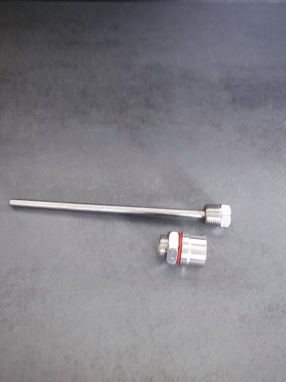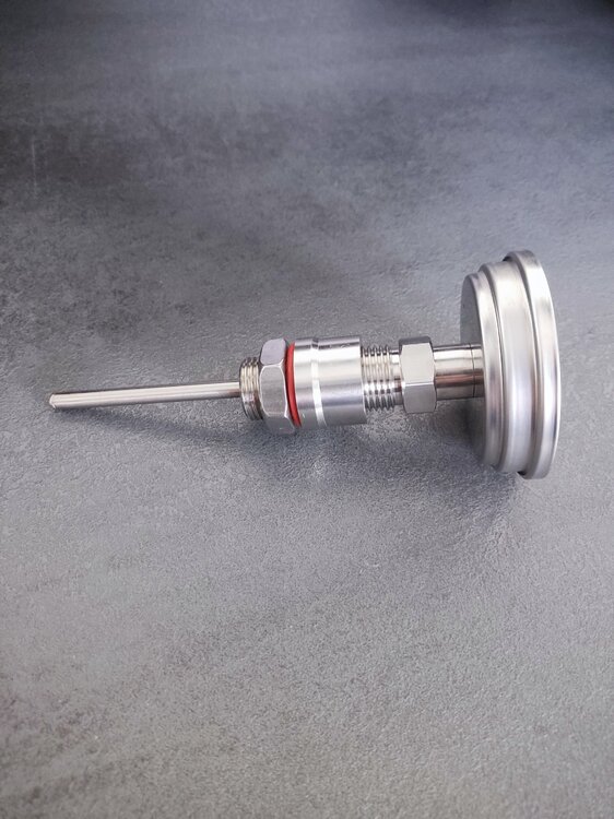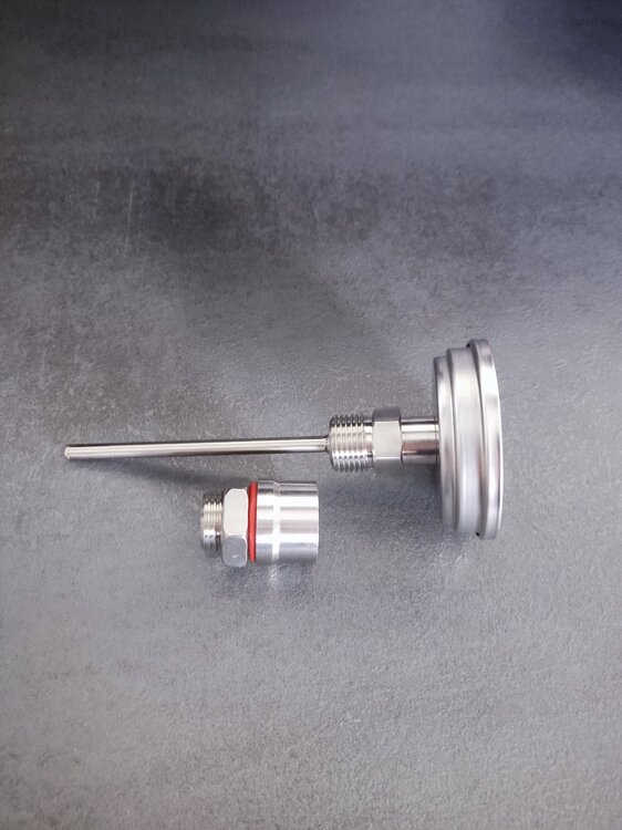 11. Zgadza się, termometr jest skręcony z gilzą ale gilza jest wkręcana w tuleję. I dopiero ta tuleja jest wkręcana do ścianki zbiornika. Okazuje się, że gilza którą miałem w domu pasuje do tulei wkręcanej do ścianki zbiornika. Jak wkręcę tę gilzę, którą miałem to będę mógł w niej umieścić sondę od termometru cyfrowego. Tak więc z Waszą pomocą problem rozwiązany. A co do ISpindla, to czy w zbiorniku z nierdzewki będzie on miał łączność z siecią wifi?