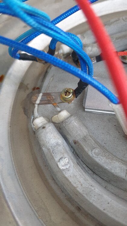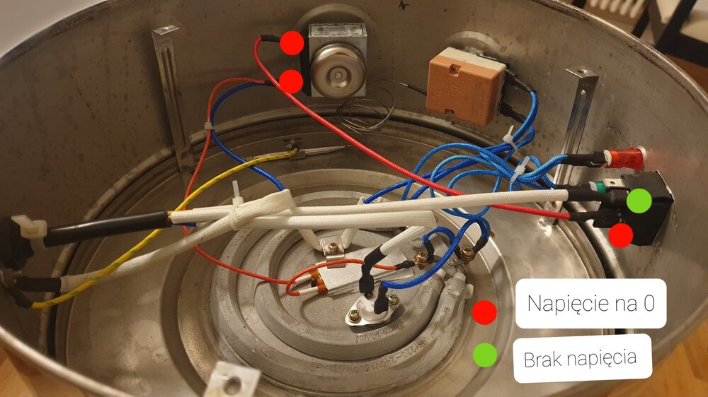 Nie mam miernika, ale sprawdziłem próbnikiem. Napięcie jest na początku i na końcu grzałki, co dziwne napięcie jest czy to na ustawieniu 1 (włączony kociołek) czy na 0 przy lampkach (czerwonej - grzanie, oraz zielona - brak grzania). W zależności od ustawienia włącznika 0 i 1 zauważyłem różnicę jak na załączonym zdjęciu. Nie, korków nie wywaliło, po prostu się wyłączył, mimo zasilania diody przestały świecić, ale dno garnka się nieźle przypaliło, zacier w kibel. Sprawdzałem na zalanym delikatnie woda.