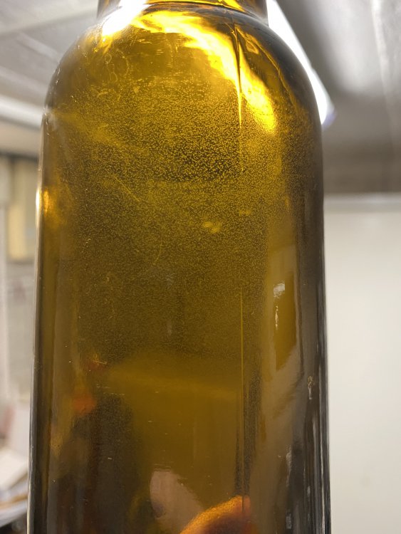 DDH NE IPA, piwo rozlane do kega i butelek. Z kega dość szybko opróżnione, bardzo dobre, super chmielowe. Po dwóch tygodniach butelka - granat. Wszystkie butelki przegazowane. Kanał bo w smaku znacznie odbiegało od kega. W kegu być może nie zdążyło się nic rozwinąć ze względu na niska temperaturę przechowywania. Po miesiącu, przy sprzątaniu piwnicy okazało się, że przeoczyłem dwie butelki. Otworzyłem, oczywiście przegazowane choć w smaku bardziej ułożone. Aromat chmielowy choć coś dziwnego jest na drugim planie. Po wylaniu zauważyłem w butelkach takie dziwne kropki. Nie mogę ich spłukać wodą, zobaczymy czy oxi sobie poradzi. Do końca nie wiem czy to infekcja czy nieukończona fermentacja. Piwo na etapie fermentacji nie wykazywało żadnych wad. Odfermentowało głęboko z 13 do 2 BLG i tak utrzymało się 3 dni. Drożdże FM zielone wzgórza. Fermentacja burzliwa 9 dni, cicha 13 + cold crash 2 dni. Te kropki ze zdjęcia wskazują na infekcję, zakażenie? Może ktoś miał podobne doświadczenie?