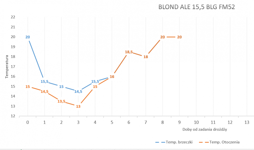 A więc tak przeniosłem wiadro do temp 20 no i oczywiście w środku mam tę samą temperaturę. Wykres: Pytanie: 1. W tym piwie nie ma żadnego chmielenia na zimno no i w zasadzie już jest pozamiatane, ale na tych samych drożdżach chciałbym zrobić jeszcze Black IPA. I w końcu pytanie. Czy czekać na pobranie gęstwy do momentu jak będę to piwo butelkować? Czy wcześniej przelać na cichą i pobrać drożdże? Kiedy jest najlepszy czas no pobranie gęstwy? Co w tej sytuacji będzie najlepszym rozwiązaniem? @punix można liczyć na radę? dzisiaj 11 dzień fermentacji temp 20-20 cały czas