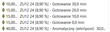114. Polish WC IPA Parametry: 13,6 °BLG, 65 IBU, 5,7%, 1,8°BLG Warzone: 06.09.2024 Rozlew: 06.09 Zasyp: RODZAJ WAGA [g] % bohemian pils wayerman 5000 100 Chmielenie i dodatki: ODMIANA AA% ILE [g] CZAS [min] Zombie 20 30 zux47 20 30 Zombie 20 20 zux47 20 20 Zombie 20 10 zux47 20 10 Zombie 40 0 zux47 40 0 whirlfloc 10min 1/2 tab Drożdże US-05 -