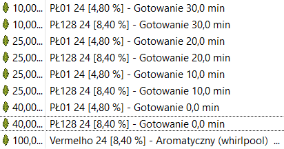 113. Polish Black IPA Parametry: 13,5 °BLG, 50 IBU, 5,6%, 4,4°BLG Warzone: 01.09.2025 Rozlew: 29.09 Zasyp: ZASYP I DODATKI RODZAJ WAGA [g] % pale ale 5000 91,8 pszeniczny czekoladowy 450 8,2 Chmielenie i dodatki: CHMIELENIE ODMIANA AA% ILE [g] CZAS [min] Książęcy 23 20 30 Vermelho 20 30 Książęcy 23 20 20 Vermelho 20 20 Książęcy 23 20 10 Vermelho 20 10 Książęcy 23 40 0 Vermelho 40 0 whirlfloc 5min 1/2 tab Drożdże S-33 gęstwa Książęcy 23 100g 15.09 -