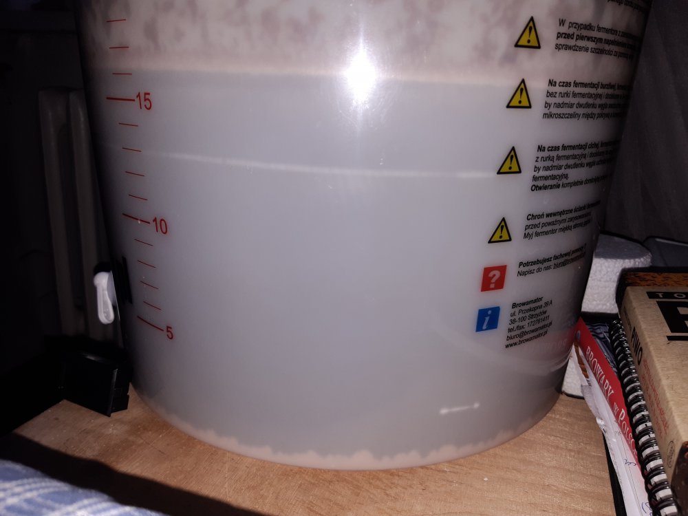 Wracam do wątku z moim saison z brew kitu. Wczoraj był mierzony ekstrakt i próbowane przy okazji. Bardzo pozytywnie mnie zaskoczyło. Mocno w stylu. Z wad to barwa (za bardzo bursztynowa, niestety tylko taki ekstrakt był do kupienia) oraz troszkę za słodkie (około 5% alko jak obliczalem, ekstrakt początkowy ~14.7 plato). Mam jednak pytanie, bo dość nurtują mnie te białe linie widoczne na ścianach fermentora, czy to może być jakieś zepsucie (zdjęcie poniżej).Mocno dbalem o czystość a w smaku zero oznak zepsucia. Nie chce jednak nie potrzebnie otwierać pokrywy, jeżeli nie ma takiej potrzeby. Drugie pytanie odnośnie refermentacji, 2 tygodnie w temperaturze pokojowej??? -