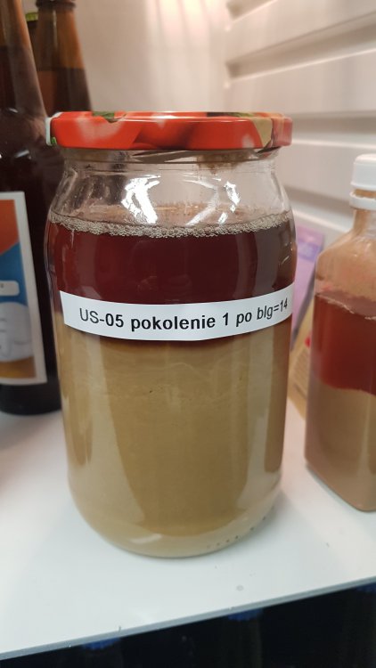 8. Poradźcie coś, pierwszy raz robiłem gęstwę na próbę. Coś tam poczytałem, coś tam pooglądałem, ktoś mi doradził aby zlać i wlać i będzie dobrze. No i nie było. Drożdże US-05, suche, uwodnione. Po zlaniu na cichą (OG=14 BLG) przelałem wszystko z dna fermentora do zdezynfekowanych słoików (zewnętrzna część fermentora dezynfekowana, ręce też). Wyszło tego 0,9l + 0,4l. Wygląda tak jak na obrazku. Dokładniej na zdjęciu jest pierwszy słoik. Co się do niego nie zmieściło poszło do drugiego. Ok 2 tygodnie później robiłem inną warkę. 70% warki zadałem świeże US-05 z saszetki, a 30% zaszczepiłem z tej gęstwy, dokładnie z tego drugiego słoika, czyli ok. 0,4l. Ta część na odzyskanych drożdżach ruszyła od razu i intensywnie, ta na świeżych nieco wolniej. Po 10 dniach burzliwej fermentacji (OG=13 BLG) mam 17,3l na 5.2 BLG i wszystko ok z fermentacją tego na świeżych, oraz 4,3l na 5.0 BLG oraz starsznie intensywny aromat/smak drożdży w tym na odzyskanych. Patrząc na dostępne kalkulatory, mocno przesadziłem z ilością gęstwy. Czy to tłumaczy efekt końcowy?