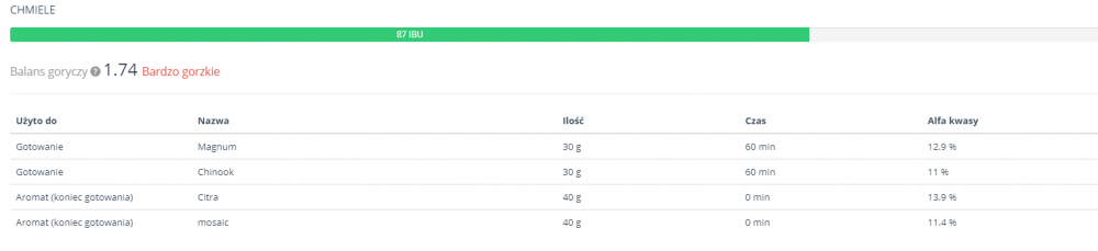 Przeliczyłem skład warki na brewness.com i wprowadziłem pewne modyfikacje w chmieleniu na goryczkę i zwiększyłem też trochę chmiele na aromat IBU 87 Co do cichej fermentacji i chmielenia na zimno - mam pytania bo nigdy tego nie robiłem jeśli bede chciał zrobić to w tym samym fermentorze to po prostu czekam aż sie burzliwa skończu (BLG nie spada) i moge uznać to że rozpicząłem cichą? fermentacje planuje przeprowadzać w 17-18stC, chmielu na cichą dodać 4 dni przed rozlewaniem - posapać po wierzchu? zamieszać? czy potem moge normalnie butelkować z zaworka w fermentorze czy musze jakoś przelewać / filtrować ?