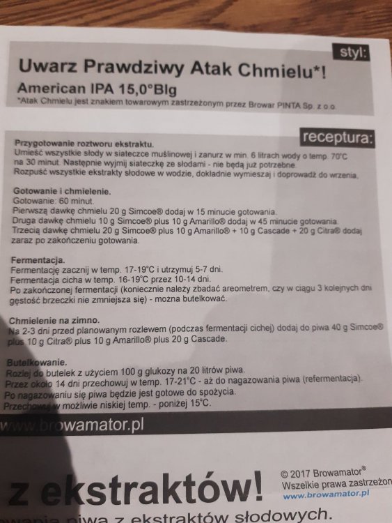 Nie mają akurat w ofercie tego Ataku Chmielu - ale to coś pewnie podobnego do tego: https://browamator.pl/ba-english-ipa-angielska-ipa-14-zestaw-na-20,3,35,955 Dzięki za filmik - obejrzę. Czyli będę potrzebować dwóch garnków po 20l każdy, jak dobrze myślę? Kupiłem garnek 10l, bo w instrukcji do Ataku Chmielu było, że taki styknie...;/ -