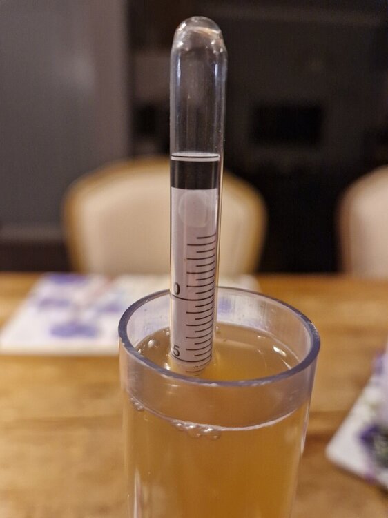 Też tak myślę, że potencjalne zakażenie (choć jak pisałem raczej mało prawdopodobne) nie objawiało by się słabym odfermentowaniem, wręcz przeciwnie. Tak, próbka była raczej odgazowana (choć kilka bąbelków przy ściance było), temp. ok. 20 C, cukromierz zakręcony kilka razy i pośrodku cylindra, odczyt znad menisku. Raczej nie ma mowy o błędzie, załączam zdjęcie. Cylindra pomiarowego używam standardowego, z BA. Też skłaniam się ku tej przyczynie, bo innych naprawdę trudno mi znaleźć... 😒 Jakkolwiek starałem się trzymać ściśle zadanych przedziałów temperatur dla kolejnych przerw scukrzających i równomiernie rozprowadzać zacier w całej objętości, to na pewno jakieś odskoki temperaturowe wystąpiły, myślę że nie da się ich uniknąć grzejąc zacier w warunkach domowych, szczególnie przy przechodzeniu np. z maltozowej do dekstrynującej. Same wskazania termometru były raczej prawidłowe, mierzyłem jednocześnie elektronicznym i alkoholowym, pomiary były dość zbieżne. @drakon, @korzen16 dzięki za Wasze odpowiedzi. Zgadzam się z Wami, że prawdopodobnie tak już po prostu będzie i nie ma co więcej drążyć tematu. Myślę, że potrzymam jeszcze 2-3 dni dla pewności i jak nadal będzie 5,5 to butelkuję i niech się dzieje wola nieba 😁 Moderatorski edit: @Glapson proszę nie pisz posta pod postem, jeśli chcesz uzupełnić użyj opcji edytuj schowanej w prawym górnym rogu pod kropkami.
