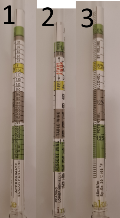 Ponownie dziękuje za wszystkie wskazówki. Teraz garść kolejnych pytań. Niewiem czy to tylko ja mam takie combo problemów czy każdy się z tym zmaga na początku. 1) Zaufanie do termometra. zacierając brzeczkę używałem analogowego termometra który otrzymałem w komplecie zestawu startowego, do tego używałem elektronicznego. I czasem temperatura pokrywała się ale przeważnie miałem różnice ok 5 st. więc na czuja wybierałem jakąś wartośc pomiędzy. Elektroniczny na 2gi dzień chyba się zepsuł, a ja dokupiłem kolejny. No i kto będzie najmądrzejszy i powie mi który pokazuje prawdę? żółty - 71 * okrągły - 61* elektroniczny 81* (ten raczej zepsuty) Pytanie jak sprawdzić termometr czy działa? gotująca się woda też szybko zmienia temp. i tu ciężko było mi wyłapać, co ma stałą temperaturę co można wykorzystać do kalibracji? 2) Kupiłem balingometr i sprawdzałem schłodzoną brzeczkę (co zostało na dnie z chmielem), ale nie mam pojęcia na jaką skale patrzeć? nie ma tam żadnego opisu Blg więc nie wiem w końcu ile tego Blg mam, poniżej zdjęcie z 3ch różnych ujęć tego samego balingometra a pod tym opis skali. A poniżej opis skale termometra 3) Jeżeli ktoś rozgryzie te skale to ile powinienem dolać wody? wyszło ok 20,5l brzeczki 4) nie bulka... W sumie to nie słyszałem ani jednego bulknięcia... i zastanawiam się czy to jest OK. minęło ok 35 godzin od dodania drożdży. Drożdże WB-06 (po otrzymaiu przesyłki trzymane w temp. pokojowej - 2 tygodnie) Pokrywa jest dość szczelna ale nie idealnie, bo miejscami jak wącham przy krawędzi to wyczuwam zapach brzeczki. -