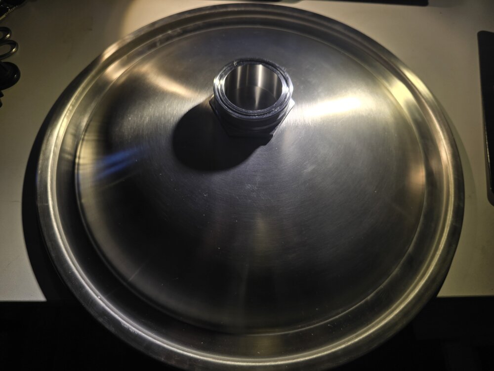 2. Pokrywa jest na górze płaska na średnicy 10 cm. Położyłem do zdjęcia element, który będzie przykręcony , czyli niejaki tri-clamp.