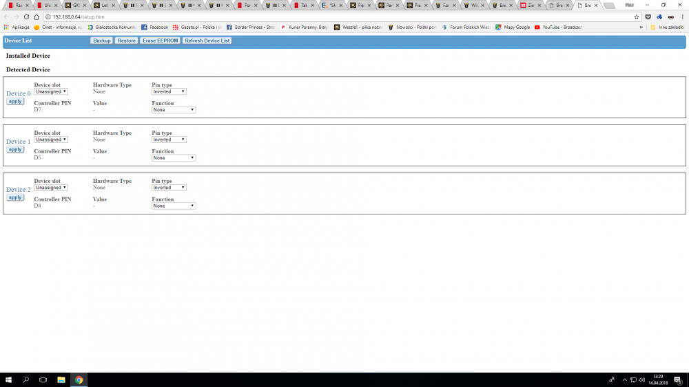 Chyba już się zbliżam do celu... Zlutowałem i zaizolowałem nowy termometr - jest sprawny, mam poprawny odczyt w Craftbeer Pi3 i w ESPEasy. Nie mogę za to uzyskać odczytu w Brewpiless. Próbowałem na wszystkich pinach, od D0 do D8. Zazwyczaj program nie widzi czujnika (jak na załączonym obrazku, 3 x "Hardware type: none"), w przypadku podpięcia do D8 układ nie odpowiada i nie mogę zalogować się przez www. Na D6 zachowuje się inaczej - klikam "Erase Eeprom" i "Refresh Device list". Pojawia się okno z napisem "Retrieving" i tak już zostaje (drugi obrazek), przy próbie odświeżenia jest komunikat: error communication between server. Co robię nie tak? EDIT: Brewpiless 2.5, ale na 2.7 było to samo. -