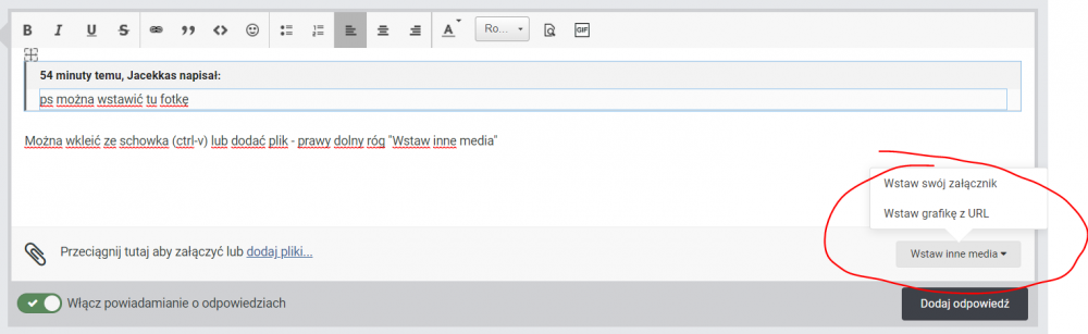 14. Można wkleić ze schowka (ctrl-v) lub dodać plik - prawy dolny róg "Wstaw inne media"