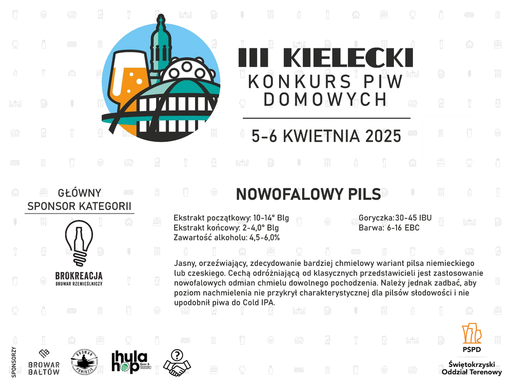 Zapraszamy wszystkich do udziału w III Kieleckim Konkursie Piw Domowych organizowanym przez Świętokrzyski Oddział Terenowy PSPD. Na dzień dzisiejszy, oprócz powyższych kategorii, zostało ujawnionych trzech sponsorów głównych, a piwa w kategoriach Belgian Blond Ale, Helles Bock oraz Nowofalowy Pils zostaną uwarzone odpowiednio przez browary Bałtów, Ponidzie oraz Brokreacja! Warto powalczyć, bo jest o co! -