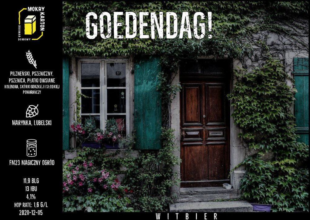 13. #35 - Goedendag! - Witbier Słody Słodownia Słód Ilość Procent Soufflet Pilzneński 2.1 41.18 % Viking Pszeniczny 2 39.22 % Pszenica 0.5 9.80 % Płatki owsiane 0.5 9.80 % 0.00 % Chmiele Gotowanie Marynka 10g 60 min Gotowanie Lubelski 20g 10 min Drożdże FM23 starter 2L 30 godzin Dodatki kolendra 10g, curacao 10g, suszone skórki słodkiej pomarańczy 10g - wszystko na 5 min Przed gotowaniem Ilość brzeczki: 28 litrów Pomiar: 9.2 Brix Do fermentora: Ilość brzeczki: 18 litrów Pomiar: 11.2 Brix Notatki: Rozlew z 125 g cukru. 38 butelek 0.5 l. --- Kalendarz: 2020-11-19: warzenie 2020-12-05: rozlew
