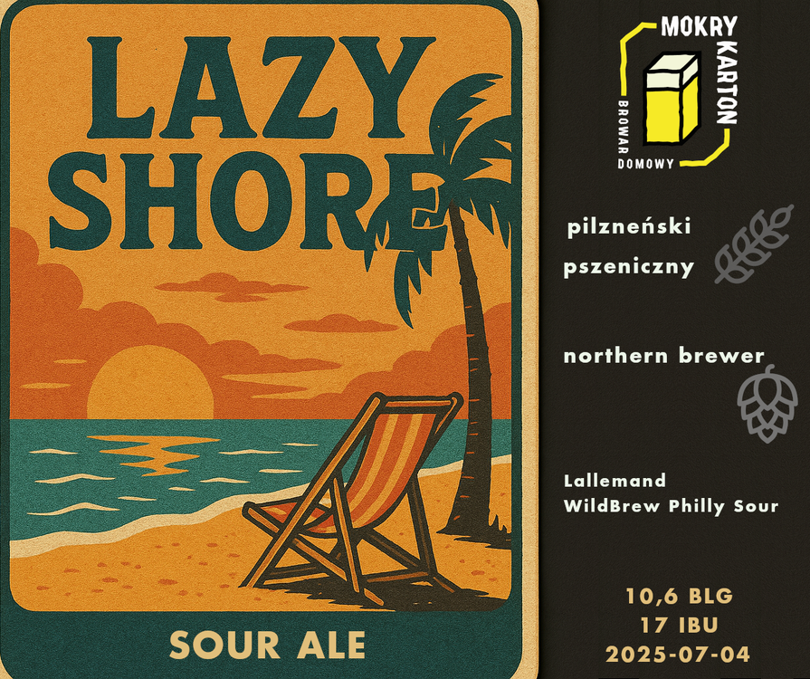 1. $44 - Lazy Shore - Sour Ale Surowce fermentujące 9.8 BLG 3.8% ABV 3.5 SRM Typ Nazwa Ilość Ekstrakcja EBC Suma 3.7 kg Ziarno Pilzneński 3 kg 81.1% 81 % 4 Ziarno Pszeniczny 0.7 kg 18.9% 85 % 4 Chmiele 17 IBU Balans goryczy 0.44 Zbalansowane Użyto do Nazwa Ilość Czas Alfa kwasy Gotowanie Northern Brewer 20 g 20 min 9 % Drożdze Nazwa Typ Forma Ilość Laboratorium Lallemand - WildBrew Philly Sour Ale Suche 11 g Lallemand Parametry: Ekstrakt: 10,6 Blg Do fermentora: 15l Pierwsza fermentacja z użyciem iSpindel: https://io-brew.piwo.org/fermentations/37 Początkowy ekstrakt zmierzył inny niż refraktometr 9,754 vs 10,6 z refraktometru, różnica -0,846 Fermentacja: ROZLEW: - 6,4 Brix na refraktometrze (~3,5 Blg) - 105g cukru (615 ml wody) - wynik: 2 mini kegi 5l + 6 butelek 0,5l --- Notatki: - gęstwa zebrana na kolejne piwo --- Kalendarz: 2025-06-14: warzenie 2025-06-14: start fermentacji 2025-07-03: rozlew