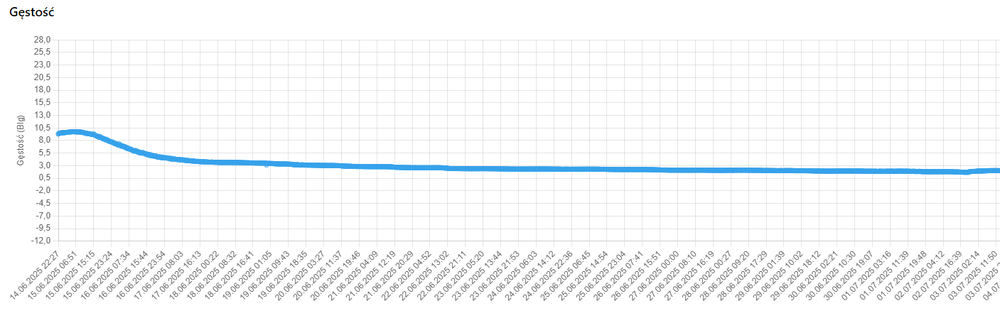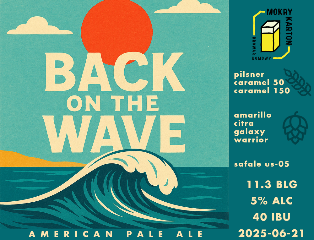 2. #43 - Back on the Wave - American Pale Ale SUROWCE FERMENTUJĄCE 11.2 BLG 4.5% ABV 5.2 SRM Typ Nazwa Ilość Ekstrakcja EBC Suma 4 kg Ziarno Pilzneński 3.8 kg 95% 81 % 4 Ziarno Strzegom Karmel 150 0.1 kg 2.5% 75 % 150 Ziarno Karmelowy 50 - Viking Malt 0.1 kg 2.5% 79 % 50 CHMIELE 38 IBU Balans goryczy 0.84 Bardzo gorzkie Użyto do Nazwa Ilość Czas Alfa kwasy Gotowanie Warrior 15 g 60 min 15.5 % Whirlpool Citra 10 g 10 min 12 % Whirlpool Amarillo 10 g 10 min 9.5 % Whirlpool Galaxy 10 g 10 min 15 % Na zimno Citra 25 g 4 dni 12 % Na zimno Amarillo 25 g 4 dni 9.5 % Na zimno Galaxy 25 g 4 dni 15 % DROŻDZE Nazwa Typ Forma Ilość Laboratorium Safale US-05 Ale Suche 11 g Fermentis --- ROZLEW - 90g cukru (615 ml wody) - wynik: 2 mini kegi 5l + 7 butelek 0,5l --- Notatki: Człowiek po 4 latach zapomniał jak używać garów Chłodzenie fermentora na początku fermentacji - wstawienie do zimnej wody. --- Kalendarz: 2025-05-31: warzenie 2025-05-31: start fermentacji 2025-06-14: fermentacja cicha 2025-06-21: rozlew