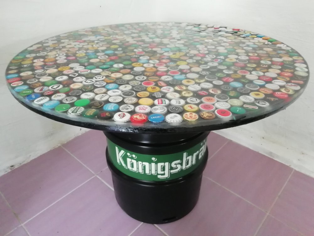 Witam. Szukałem na forum, nie znalazłem, więc zamieszam fotorelację z tworzenia stolika kawowego/ piwnego wyklejonego kapslami piwnymi i zalanego żywicą epoksydową. Pomysł zaczerpnięty z Youtuba. Mam nadzieję, że informacje komuś się przydadzą, albo wpis zainspiruje kogoś to własnej twórczości. 1. Założenie było takie aby zrobić coś z niczego i poeksperymentować z żywicą epoksydową. Miałem kupować jakiś ładny drewniany stolik pod to, ale postanowiłem użyć to co miałem "na zbyciu". Kapsle miałem po zbieraniu na wyklejanie ściany od piwniczki. Blat to znak drogowy ze złomu o średnicy 40cm. Podstawa to keg 50l, który kupiłem okazyjnie za jakieś 30 zł i raczej w najbliższym czasie nie wleję do niego piwa, bo używam petainerów. Blat jest nałożony na kega, nie jest przytwierdzony na stałe. Trzyma się w miejscu dzięki przymocowanym na nity ośmiu kątownikom. Także to jest mój wariant. Dużo prościej i estetyczniej byłoby wykorzystać jakiś ładny drewniany niewielki stolik. 2. Tworzenie. Zacząłem od pomalowania na czarno znaku. Potem trzeba było wymierzyć gdzie jest środek, przyłożyć keg obrysować go aby wiedzieć gdzie przymocować kątowniki. Nity nadały się do tego całkiem nieźle, Obawiałem się, że żywica będzie uciekać przez otwory, ale jest ona na tyle gęsta, że nie stanowiło to większego problemu. Także mocujemy 6-8 nitów do blatu tak aby okalały kega. Następnie czas na przyklejenie kapsli. Trzeba je przykleić, bo inaczej po zalaniu po prostu oderwą się i wypłyną do góry. Jest to dość czasochłonne. Użyłem kleju wyciskanego z pistoletu. Nie waliłem kleju pod każdy kapsel tylko wyciskałem okrąg z kleju i dociskałem kapsel. Także trzymał się on lekko w dwóch miejscach. To wystarczyło. Po zalaniu tylko jeden się odkleił i trzeba było go zatopić w żywicy. Także klejenie poszło sprawnie, gdybym walił klej grubo pod każdy kapsel to wyszłoby ładniej, ale zużyłbym pewnie ze 2-3 kleje, a tak poszedł jeden. Plusem klejenia każdego kapsla jest to, że w ogóle nie widać kleju. U mnie popełniłem błąd, że jest biały klej na czarnym tle i trochę to źle wygląda jak się przyjrzeć. Trzeba było wziąć czarny klej, albo zrobić białe tło i byłoby lepiej. Kapsle kleiłem na oko. Zacząłem od zewnętrznego okręgu i schodziłem do środka po prostu. Jeśli kapsle się nie zgrywają to wystarczy delikatnie zagęścić lub rozszerzyć 3-4 kapsle i można to ładnie wycyrklować tak aby wyszedł ładny okrąg. 3. Wylewanie żywicy. Po wyklejeniu kapsli trzeba czymś okleić boki. Dobrze byłoby użyć jakiejś twardej, ale elastycznej listwy - metalowej lub takiej jak podłogowa od paneli. Ja od biedy okleiłem rant taśmą dwustronną i okleiłem to taką pianką co się daje pod panele podłogowe. Wyszło całkiem ok. Tylko, że ta pianka się przykleja do żywicy i trzeba potem to odciąć i szlifować. Gdyby dać coś twardego to wystarczyło by pewnie tylko to oderwać i krawędź byłaby już ładna sama z siebie. Samo rozrobienie żywicy jest bardzo proste. Ja zamawiałem porcje 1kg i 1,5kg na allegro. Żywica przychodzi w dwóch pojemnikach, które są tak odmierzone, że wystarczy je ze sobą zmieszać wg instrukcji (o ile używamy całej na raz). Roztwór jest dość gęsty, ale pojawił się u mnie kilka przecieków. Także polecam profilaktycznie wyłożyć podłogę gazetami w razie czego. Żywica jest gęsta, ale poziomuje się sama. Także warto przed wylaniem wypoziomować powierzchnię wylania. U mnie wyszło trochę krzywo. Dwa boki ładnie wylane a dwa zbyt płytko niestety. Po wylaniu mamy sporo czasu zanim to zgęstnieje i można rozprowadzać żywice jakąś szpatułką, ale jak są krzywizny to na niewiele się to zadaje, bo ona sama się poziomuje po dłuższej chwili. Tak jak piszą w instrukcji trzeba uważać przy mieszaniu, aby nie powstało zbyt wiele pęcherzyków powietrza. 4. Użyte ilości. Do wykonania stolika o promieniu 0,4m (średnica 0,8m), czyli o powierzchni ok 0,5m2. zużyłem: 627 kapsli. Tubka kleju ok 400ml, 2,5kg żywicy epoksydowej. Z tym, że tej żywicy w moim przypadku lekko krzywego stołu przydało by się jeszcze z 1kg dolać. Czyli mogłem kupić od razu wiaderko 3 kg. Koszt: żywica - 106zł kapsle - wiele zmiennych ale tak 50gr za kapsel to lekko, więc 314zł. Kątowniki, klej, nity, farba - nie pamiętam, ale jakieś 30-40zł U mnie keg jako podstawa 30 zł. Uwagi: - Żywica jest dość wdzięczna w obróbce wystarczy nieco zdolności majsterkowania. Zalać nią można również inne rzeczy. Myślę, że całkiem fajnie mógłby wyglądać stolik z zalanymi etykietami piwnymi, waflami pod kufel, albo można ułożyć jakiś wzór z kapsli kolorowych takich jak do kapslowania piwa domowego. - Stolik stoi już prawie miesiąc na dworze i trzyma się dobrze, Pojawiają się drobne rysy. Pewnie można by go od góry przejechać jakimś lakierem w sprayu czego ja na razie nie zrobiłem. Mam nadzieję, że zawarłem kilka wskazówek, jak coś to pytać. Pozdrawiam.