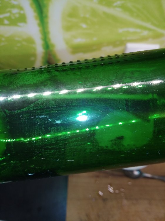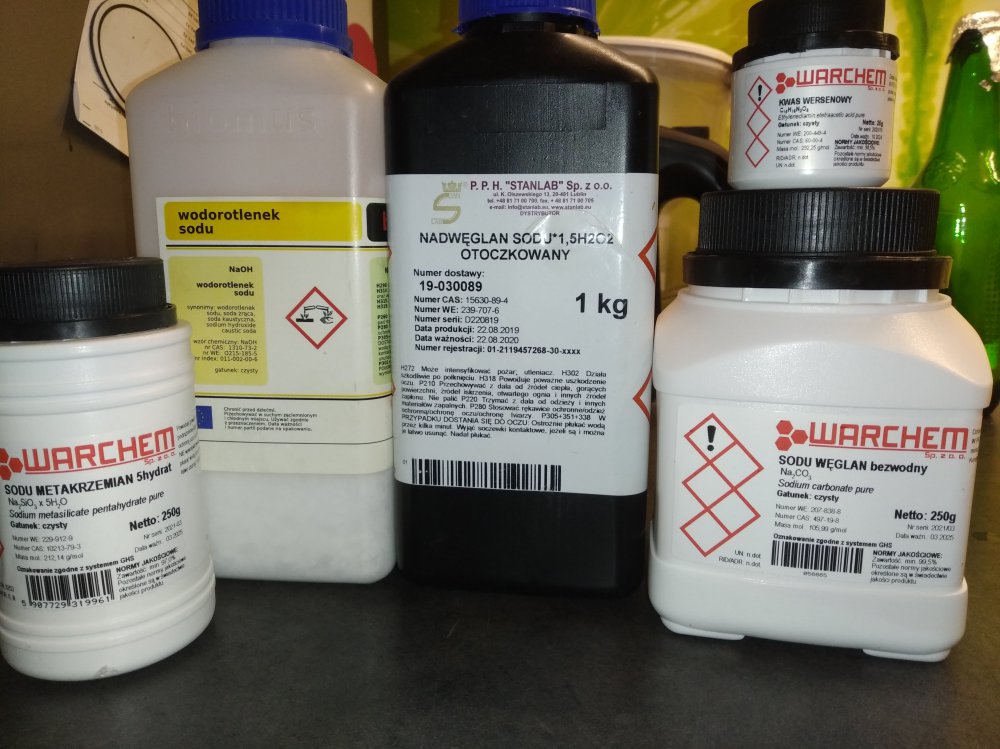 20-35% metakrzemian sodu - 175g 15-30% nadwęglan sodu - 150g 20-30% węglan sodu - 150g 1-5% kwas wersenowy -25g 1-3% wodorotlenek sodu -15g Dwie ostatnie pozycje można zrobić po 2,5% ilość na 500g, trwałość to od 6-12 miesiecy. koszt produktów to koło 30zl bez wysyłki. Wszystko odważyłem w thermomixie i wymieszałem. Zielona butelka na której jest osad z drożdży byla około 12godzin zalana zimnym, już używanym wczesniej kilka razy NaOh. Napewno działa bo poczerniała mi deska do krojenia i zeszła skóra z palców. A osad nie puscił. Do zielonej butelki wlałem roztwór własnego PBW 7g/500ml na 5 minut i potrząsałem 3 razy w ciaągu tego czasu efekty widać na zdjęciu. Efekty po 30 minutach są na brązowej butelce która była zarośnięta tak samo. Papierki lakmusowe jak widać idą bardziej w obojętny odczyt niż kwaśny.