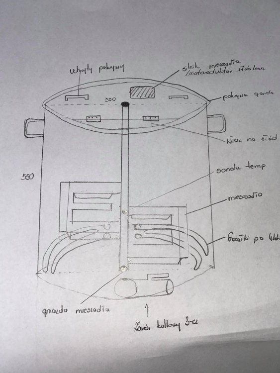 Witam wszystkich czytających, po długich godzinach składania wszystkiego w całość, kilku różnych koncepcjach ostatecznie chciałbym zaprezentować swój pomysł i poprosić o uwagi korygujące potencjalne błędy i niedociągnięcia, które niewątpliwie w tym projekcie się pojawią. Do niektórych elementów mam pytania i liczę tu na waszą pomoc. Na początku zaznaczę, iż moja wiedza w zakresie elektryki/techniki jest dość uboga, dlatego nie będę ukrywał, że większość działań będzie zlecona lub wyproszona u znajomych, którzy te wiedzę posiadają. Pytania i wątpliwości wytłuściłem. kadź zacierno-warzelna: Powstanie ze 130l. gara ze stali nierdzewnej firmy inox. Gar zgodnie z rysunkiem (na dole posta) zostanie wyposażony w dwie grzałki o mocy 4kW każda. Czy ta moc wystarczy? Grzałki chciałbym zamówić na stronie e-grzałki (zależy mi na półokrągłbym kształcie). Zawór kulkowy 3-cz wkręcany na nypel, ze złączem camlock. Mieszadło łopatkowe również robione na wymiar. Tutaj rodzi się najwięcej pytań. Silnik od wycieraczek 24v może dać sobie radę? Czy tylko motoreduktor wchodzi w grę? Zastanawia mnie również instalacja mieszadeł w innych projektach, tj. czy mieszadło musi być usadzone w jakimś gnieździe w podstawie garnka? Jeśli tak to jakie rozwiązanie jest najlepsze? Pokrywa garnka chciałbym żeby była miejscem instalacji silnika/reduktora oraz mieszadła. W jeden trzeciej długości chciałbym przeciąć pokrywę i zamontować zawiasy aby zrobic właz na słody/chmiele. Zastanawiam się czy nie wzmocnić pokrywy jakąś poprzeczną belką? Mieszadło + silnik/motoreduktor jednak trochę ważą. Przy gotowaniu od czasu do czasu trzeba zamieszać piwo, dlatego chciałbym zostawić pokrywę z mieszadłem. Czy otwarty właz wystarczy na odparowanie DMS'u? Czy do gotowania darować sobie mieszadło i od czasu do czasu przemieszać ręcznie? Nieco nad grzałkami zainstalowana będzie sonda termometra. Skoro mowa o sondzie tutaj wspomnę, że cały system rPi stawiać będzie mój znajomy. W tym przypadku chciałbym żeby ograniczało się do sterowania grzałkami oraz mieszadłem. Płynowskaz to przdatny dodatek jednak nie chciałbym już za bardzo wiercić w tym garnku. Widziałem gdzieś jak ktoś miał zainstalowany płynowskaz przed kranem kulkowym. Czy ktoś zna te rozwiązanie? 2. kadź filtracyjna Nie zależy mi na pełnej automatyce browaru. Myślałem przez pewien czas o pompie do zacieru, ale przerosło to moją głowę. Dlatego w tym aspekcie chciałbym zachować dotychczasowy system. Udało mi się znaleźć 10l. rondel, który myślę świetnie się sprawdzi do przenoszenia zacieru. Rozwiązania dla kadzi znalazłem dwie. Budżetowa zakłada zakup trzech fermentorów plastikowych 42l., + trzy węże z oplotu. Druga to zakup pojemnika fermentacyjnego ze stali nierdzewnej 160l., znalezione na allegro. W nim zainstalowałbym kran no i filtrator czteroramienny, który spokojnie powinień dać sobie radę z taką ilościa zacieru. Dodatkowo myślałem o instalacji deszczownicy w pokrywie z rurek pex. W czasie filtracji myję kadź zacierną w której za chwilę będę gotować brzeczkę i instaluję Hopstoper. Piwo chciałbym chłodzić za pomocą płytowego wymiennika ciepła. I tutaj kolejne pytania, jaką ilość płyt polecacie? Znalazłem na allegro alternatywę dla drogich wymienników ze sklepów piwowarskich: https://allegro.pl/oferta/wymiennik-ciepla-30-plytowy-25kw-3-4-dn20-7340376950?fromVariant=6977565153 Nada się? Schłodzoną brzeczkę odbierałaby pompa, która wtłaczałaby piwo do fermentora. Pompa o której myślę to15R z aliexpress. Wysokie wlewanie mam nadzieję, że wystarczy do napowietrzenia brzeczki. 3. fermentacja Znowu są dwie wersje. Na pewno zależy mi na stożkowym fermentorze, chciałbym zacząć od jednego, z możliwością odbioru gęstwy i przeprowadzenia fermentacji cichej bez przelewania: https://domowybrowarek.pl/produkty/27--pojemnik-stozkowy-115-l-stelazs https://browamator.pl/zbiornik-stozkowy-tabec-poj-200-l-stal-nierdzew,3,11,2365 Dla fermentora zrobiłbym skrzynię wyłożoną wewnątrz styropianem. Póki co nie myślę o agregatach chłodzących, temperatura w piwnicy latem wynosi ok. 18 stopni więc jest ok, a póki co nie planuję warzyć dolniaków. Agregaty chłodzące to melodia przyszłości. W przypadku pierwszych dni fermentacji myślę, że baniaki 5 l. z lodem spokojnie zbiją temperaturę. Do podnoszenia temperatury chciałbym użyć silikonowych mat grzejnych (gdzieś widziałem to zastosowanie). Co można użyć do izolacji tych mat (maty zagrzejnikowe + karimata?) i jaka moc tych mat byłaby najlepsza na tę ilość piwa? Czy takie maty mógłbym zastosować w przypadku tego pierwszego plastikowego fermentora? Póki co to chyba wszystko. Proszę o wyrozumiałość i dobre rady. Z góry dziękuję za wszelką pomoc. PS: Proszę wybaczyć mój brak talentu rysunkowego.