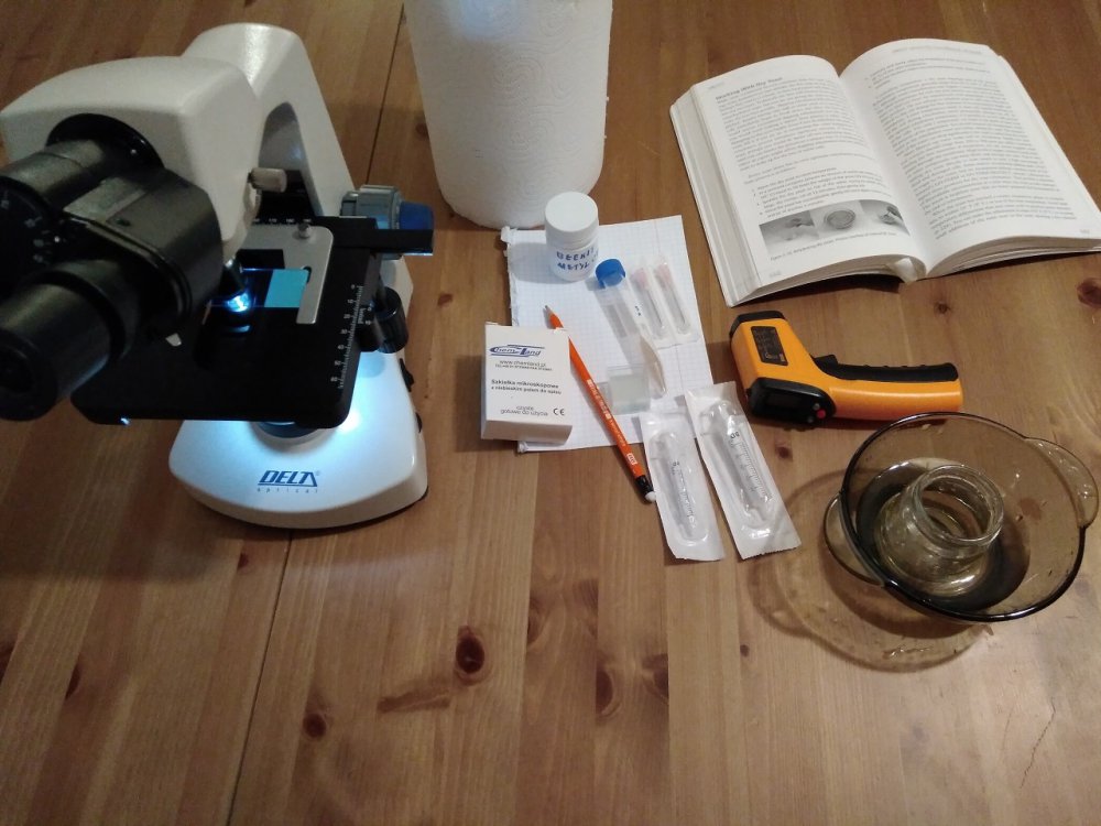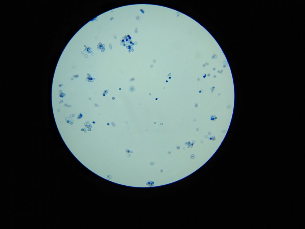 Słowem wstępu. Miałem dzisiaj wolny wieczór i postanowiłem poświęcić go na przypomnienie obsługi mikroskopu, by nie świecić oczami podczas Festiwalu Piwowarów Domowych. Na forum w przeciągu tygodnia padło dwukrotnie pytanie odnośnie rehydracji drożdży i temperatury w jakiej proces powinien się odbywać. Postanowiłem użyć moją awaryjną paczkę suchych drożdży s04 i to sprawdzić. Termin mają do września 2018. Czasu miałem mało więc eksperyment musiał być relatywnie krótki. Zaplanowałem to tak. Zrobię rehydrację w dwóch temperaturach ~41°C oraz ~25°C. Wybarwię preparaty błękitem metylowym i zrobię zdjęcia. Wnoski każdy wyciągnie sobie sam Instrukcję rehydracji wziąłem z książki Yeast : The Practical Guide to Beer Fermentation. W skrócie wygląda tak: 1. Ogrzej drożdże do temperatury pokojowej. 2. W zdezynfekowanym pojemniku przygotuj sterylną wodę o temperaturze 41°C. Odmierz 10 razy więcejwody jak drożdży. Około 10 ml wody na gram drożdży (zrobiłem odstępstwo, użyłem 10 ml na 0,5 grama). 3. Rozsyp drożdze na powierzchni wody unikając grudek. Pozwól tak im spędzić 15 minut. 4. Kiedy już wchłoną wodę, delikatnie zamieszaj i zostaw je jeszcze na 5 minut. 5. Powoli i delikatnie wyrównaj temperaturę drożdży z brzeczką, nie powinna być większa jak 8°C. 6. Zaszczep brzeczkę, najlepiej tak szybko jak możesz. Dwa ostatnie kroki mnie nie interesują. Do eksperymentu użyłem drożdży s04. Leżały blisko rok w lodówce. Drożdże suche prawidłowo przechowywane wg podręcznikow powinny tracić około 4% żywotności na rok. Większość sprzętu, który był w użyciu jest na poniższym zdjęciu. Eksperymentu nie robiłem w warunkach aseptycznych, bo nie zamierzałem ponownie używać drożdży. Książka na którą się powołałem. Słoik w salaterce. W słoiku będę uwadniał 0,5 grama drożdży w 10 ml przegotowanej wody z kranu. Kąpiel wodna zwiększa bezwładność i temperatura tak szybko nie spada. Oczywiście temperatury kąpieli i wody w słoku były wyrównane i kolejno wynosiły 41°C oraz 25°C. Kartka i ołówek by notować. Błękit metylowy. Jest to barwnik. Wnika w martwe drożdże. Zdrowe i żywe drożdże nie wpuszczą go przez membranę. Zatem martwe będą niebieskie a żywe będą miały tylko niebieską otoczkę. Pirometr, do mierzenia temperatury. Ma wystarczającą dokładność. Mikroskop, pracowałem na powiększeniu 400x. Szkiełka podstawowe i nakrywkowe. Przez okular zrobię zdjęcie. Potem będziecie sobie mogli policzyć stosunek martwych do żywych. Ilość drożdży tutaj jest drugoplanowa, bo proporcja powinna być zachowana. Igły i strzykawki do transferów. Probówki falcon, służyły mi do rozcieńczania. W jednym mililitrze pobranych drożdży było ich zbyt wiele, dlatego próbkę trzeba rozcieńczyć. Czas na eksperyment: W słoiku ciepła woda o temperaturze ~41°C, probówki do rozcieńczania również trzymałem w kąpieli, aby ochładzały się równo. Zaszczepiłem 0,5 grama drożdży i odczekałem 15 minut. Następnie wymieszałem delikatnie i odczekałem kolejne 5 minut. Zamieszałem ponownie i strzykawką przeniosłem 1 ml do rozcieńczenia. Rozcieńczenie około 20 razy (dobrałem je empirycznie jeszcze przed eksperymentem). Z rozcieńczonej próbki pobrałem 1 ml i dopełniłem 1 ml barwnika (0,1% błękit metylowy). Łącznie rozcieńczenie około 40 razy. Zrobiłem z próbki preparat. A oto wynik: Mocno niebieskie kropki są to martwe drożdże. Pozostałe żywe i gotowe do działania. Przy moim kulawym liczeniu wyszło około 90% żywych komórek. Poniżej zdjęcie powtórzonego eksperymentu, tym razem w temperaturze 25°C. I tutaj miałem problemy z przygotowaniem ładnego preparatu. Dwukrotnie powtarzałem eksperyment dla 25°C i dwukrotnie drożdże odmówiły współpracy. Zbijały się w mocne gromadki. Zdjęcie nie jest już takie ładne jak wyżej. Jednak to co mogę powiedzieć to zdecydowanie więcej widziałem martwych przy rehydracji w temperaturze 25°C. Może nie było to 50% jak straszą w podręczniku ale przynajmniej dwukrotnie więcej martwych jak przy rehydracji w temperaturze 41°C. Oczywiście powyższy eksperyment nie powinien być traktowany jako wyrocznia. Zrobiłem go bardzo szybko i bez żadnej metodologii. Jak będę miał więcej czasu to go powtórzę, tym razem z jakimś antyzbrylaczem. Jeżeli będziecie chcieli możemy spróbować go powtórzyć na FPD. Jako dygresja, jeden z forumowiczów napisał, że chce sprawdzić czy StarSan zabija Bretty. Ja biorę StarSan a on trochę zbreconej gęstwy. Zobaczymy co się stanie. Jak wybierasz się na festiwal o zapraszam do mojego mini laboratorium. Będziesz mógł zabrać ze sobą próbkę bardzo fajnych drożdży.- 37 odpowiedzi