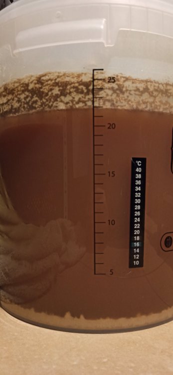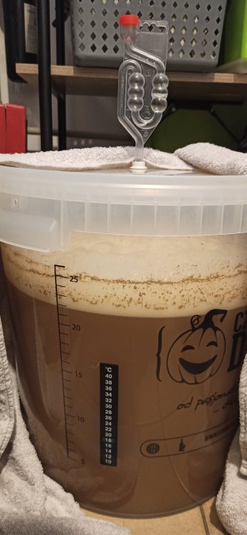 Jest to moje pierwsze ważenie. WIKI w etapach fermentacji podaje: faza opadających krążków - zanika proces fermentacji, piana opada, drożdże opadają na dno, lub czasem w przypadku górnej fermentacji unoszą się na powierzchni w postaci zbitego kożuszka. Jest to moment w którym można już rozważać przelanie piwa na fermentację cichą. Poniżej 2 zdjęcia. To z w miarę wysoką pianą zrobione 44 godziny po zadaniu drożdży (rano po zadaniu drożdży zajrzałem pierwszy raz do piwa po 14h i piana była już prawie na maksymalnym poziomie), drugie foto z opadniętą pianą (została tylko na ściankach, na powierzchni bardzo cieniutka) i dużo większą warstwą drożdży na dnie zrobione równo przed chwilą, czyli 3 doby (74h) po dodaniu drożdży (ale już z 8h wcześniej tak to wyglądało). Czy mam się martwić? nie za szybko opadło? czy kondycja drożdży jest ok? Bulka wprawdzie średnio co 20 sekund. Brzeczka z 3 słodów x 1.7kg, 22 litry, uwodnione s-04 (ładnie rosły w szklance choć dodane po 70 minutach od rozpuszczenia w wodzie). BLG początkowe 16 a obecnie 6,5. W probówce do cukromierza bardzo dużo drobniutkich bąbelków zasuwa z dołu do góry. W smaku dość piwne, nie czuć octu czy przytłaczających drożdży, aromat cytrusowy (amerykańskie chmiele bo to z założenia AIPA) Drożdże dodane do brzeczki o temp 22 stopni po czym w 90 minut schłodziłem brzeczkę do 18 stopni, do rana spadła do 16 stopni. po 36h zamknąłem okno w pomieszczeniu gdzie siedzi fermentor i temp wzrosła do 18. po następnych 12h stwierdziłem, że za wcześnie na podnoszenie temperatury i znów otworzyłem okno a temperatura spadła do 16 stopni. teraz przez to opadnięcie znów zamkąłęm okno by wyższa temperatura pobudziła drożdżaki. Ogólnie to namieszałem sporo z tymi temperaturami i boje się, że to zaszkodziło drożdżom. fermentor leży cały czas owinięty ręcznikiem (również z góry) i dostaje mało światła. Planowałem potrzymać jeszcze z 2-3 dni w 18 a później do 20-21 do zakończenia burzliwej. Jak wam, doświadczonym, to wygląda? Mam zostawić zgodnie z planem? czy pobudzać "mechanicznie"? Zamieszać fermentorem? dodać papu? czy zwiększyć temperaturę? Jakiego finalnego BLG się spodziwać przy s-04 i początkowych 16 stopniach Balinga?