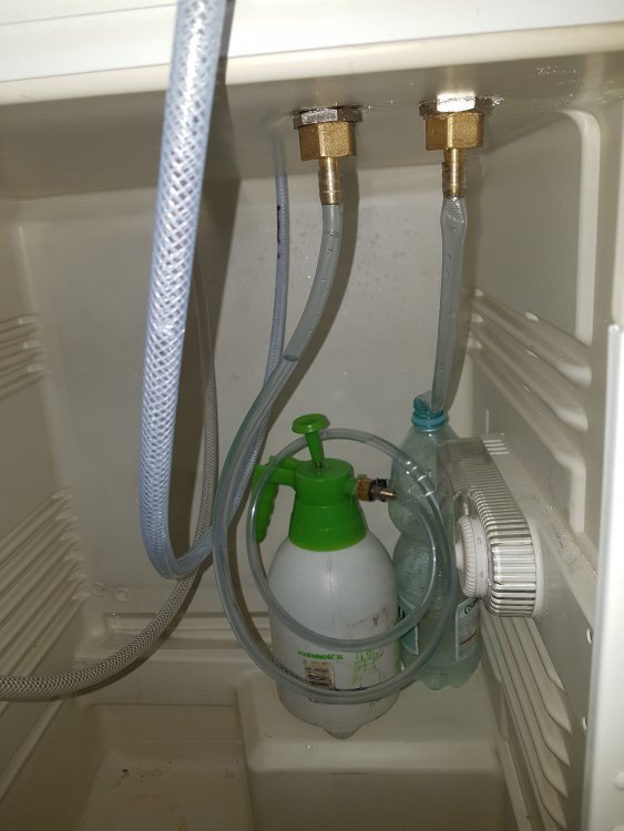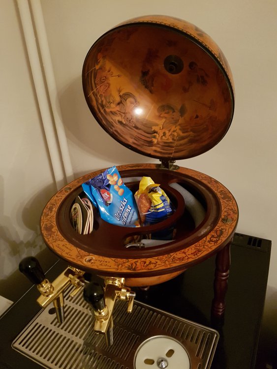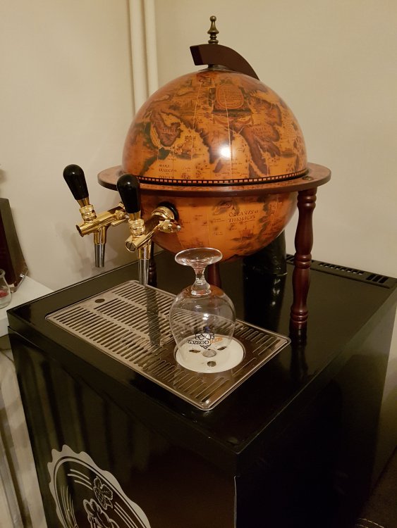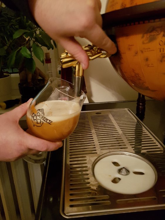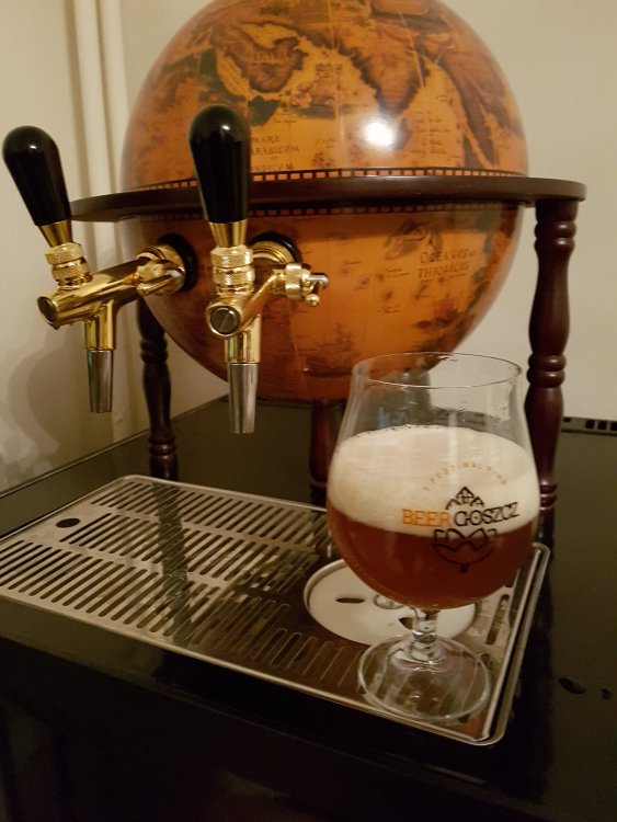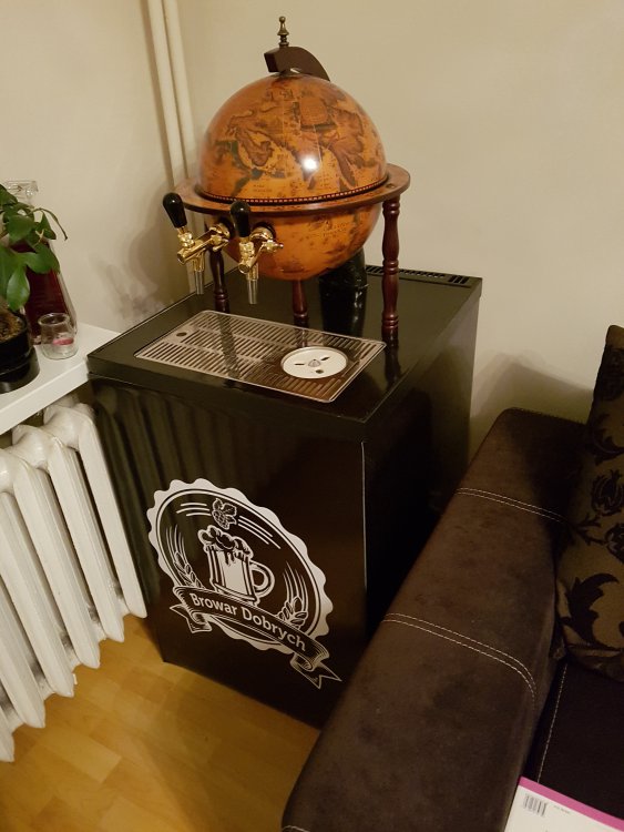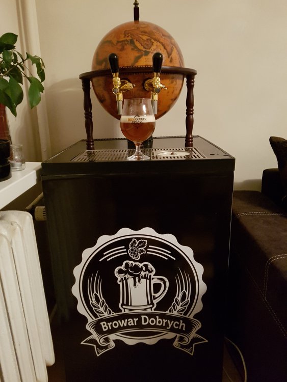 Witam wszystkich, Oto mój pierwszy i na pewno nie ostatni kegerator. Wyszedł trochę drożej niż zakładałem (ponad 2000zł i ok. 8 godz. pracy), ale i tak było warto... Koszty: lodówka liebherr kt 1730 300 zł 2x kegi cornelius(wraz z przesyłką) 443 zł reduktor (wraz z przesyłką) 120 zł globus (barek) 180 zł magnesy na lodówkę 176 zł butla 5kg co2 (pełna) 150 zł ociekacz ze zraszaczem 52 zł krany do piwa celli, złączki cmb, obejmy, wężę 540 zł końcówki do ociekacza/zraszacza 12 zł końcówka do spryskiwacza (toczona) 25 zł otulina do węży 3 zł silikon 20 zł spray 24 zł okleina na blat 7 zł RAZEM 2052 zł Niestety, jak widać powyżej, nie wszystko udało mi się okazyjnie dostać i z pewnością mógłbym jakoś zejść z ceny (np rezygnując z magnesu na 3 stronę lodówki której i tak nie widać), ale piwo to poważna sprawa, więc jak coś robić to porządnie:-) Cała instalacja, jest wobec tego trochę "na bogato" (no może nie licząc zraszacza). Zraszacz jest zasilany ciśnieniowym spryskiwaczem kupionym kilka lat temu w Biedronce ale daje rade! Oczywiście wygodniej było by mieć wodę w jakimś małym kegu, ale przy 2 zbiornikach z browarem, najzwyczajniej w świecie nie ma na to miejsca. Co jakiś czas trzeba ręcznie podpompować ciśnienie, ale skoro i tak co jakiś czas otwieram lodówkę (by sprawdzić ciśnienie, temperaturę i wylać zużytą wodę) to w sumie taki zabieg to nie problem. Kilka słów o materiałach: Lodówka znaleziona na OLX, napełniona freonem, szczelna, sprawna, z wymiarami pozwalającymi na umieszczenie kegów bez żadnej ingerencji (poza wyciągnięciem półek). Blat lodówki oklejony czarną błyszczącą folią, a rant pomalowany sprayem imitującym tablice kredową. Dzięki temu mogę opisać co się leje z jakiego kranu. Cała instalacja (poza lodówką) jest w otulinie. Następnie, na węże i "nogę globusa" nałożyłem tubę od whisky, którą obkleiłem czarną duck tape. Obudowa na pozór tandetna, ale o dziwo dobrze wygląda i nie ma potrzeby budowy czegoś innego. Tym bardziej że uwaga wszystkich skupia się gdzieś indziej... Krany złote celli z kompensatorami. Wysokość kranów jest uwarunkowana wielkością globusa, w związku z czym niestety żadne szkło nie stanie pod kranem. Niby duży minus, ale w sumie szkło podczas nalewania piwa i tak trzeba trzymać pod kątem, w związku z czym ostatecznie nie stanowi to żadnego problemu. Spokojnie da się napełnić każdy rodzaj szkła nawet butelki, tylko po co:-)? Globus, kupiony gdzieś na OLX, przerobiony, tzn. tam gdzie obecnie zaczyna się lodówka, wcześniej znajdował się dodatkowy blat (z którego to dopiero wychodziły nogi). Magnesy na lodówkę maskują wszystkie uszczelki, przez co kegerator nie przypomina lodówki i po prostu dobrze wygląda. Jeśli ktoś jest ciekawy jakichkolwiek innych szczegółów budowy to chętnie odpowiem. Pozdrawiam! Dobry ps.: a tak na marginesie, to cześć! (mimo, że na forum zaglądam od dość dawna, to postanowiłem coś napisać dopiero gdy może to kogoś zainteresować, w związku z czym to mój pierwszy post...)