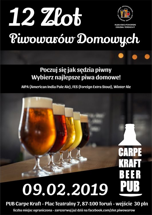 Cześć i czołem! Jak pewnie wiecie 09.02.2018 organizowany jest już XII Zlot Piwowarów Domowych!! Serdecznie zapraszamy w imieniu Kujawsko-Pomorskiego Oddziału terenowego PSPD!! Cena wejściówki 30pln! 3 style: AIPA (American Indian Pale Ale) FES ( Foreign Extra Stout) Winter Ale- kategoria semi-open: piwo górnej fermentacji z dowolnymi dodatkami i przyprawami kojarzącymi się z zimą, ekstrakt piwa winien mieścić w przedziale 12-18º Blg Więcej informacji Tutaj! oraz na Facebooku!! Serdecznie Zapraszamy Wszystkich Piwowarów oraz chętnych!