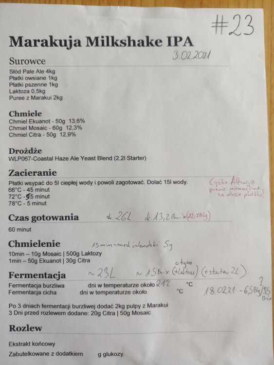 Witam Uwarzyłem jakiegoś bubla ? z laktozą i nie mogę się wgl połapać co z czym i jak. Od początku to wgl miałem problem z tym piwem bo chyba przez ilość płatków zrobiło się takie gęste że nie szło tego przefiltrować. Ale jakoś już poszło, w sumie mało kiedy robię próbę jodową, teraz do samego końca zacierania wskaźnik lekko się barwił. Mimo długiego zacierania. Wyszło mi ok 23l brzeczki ok 15brix w tym 500g laktozy plus starter 2l. Podczas fermentacji dodałem 2kg pulpy z mango. Dziś odczyt refraktometru pokazał ok 9,2-9,5brix a balingomierz 6,5blg. Piwo fermentuje już 15dni w temp 21'c. Drożdże White Labs WLP067 Coastal Haze Ale Yeast Blend Nie mam pojęcia jak obliczyć odfermentowanie? I czy wgl pomiary byly dobre bo brzeczka była taka bardzo oleista, gęsta.