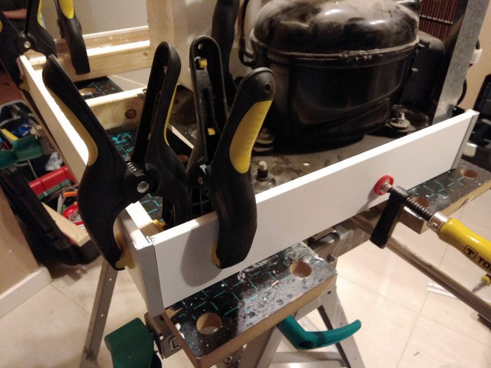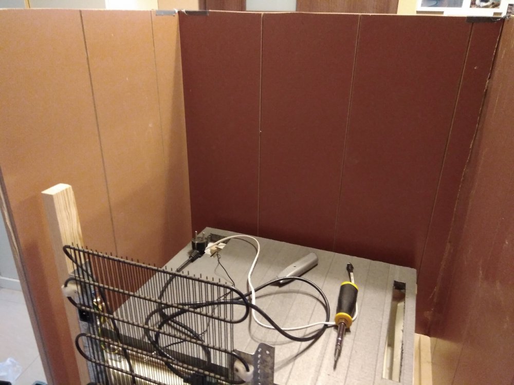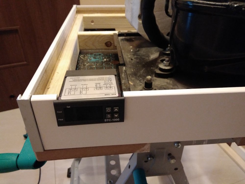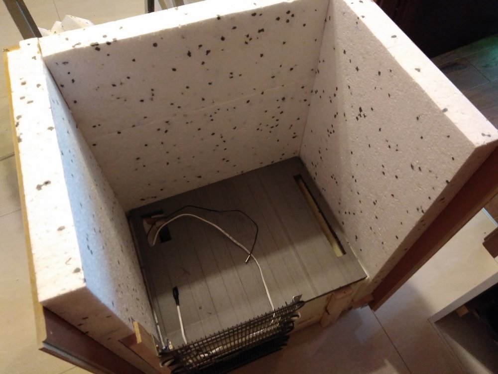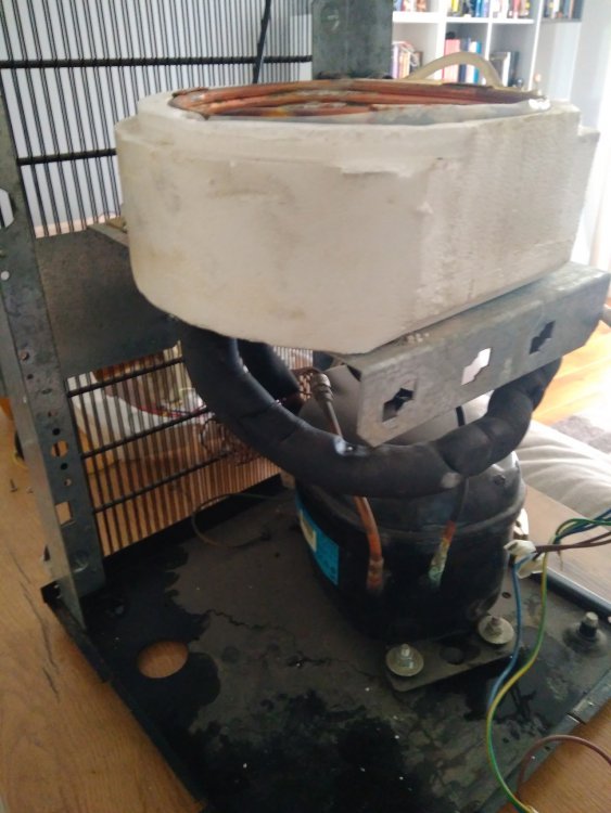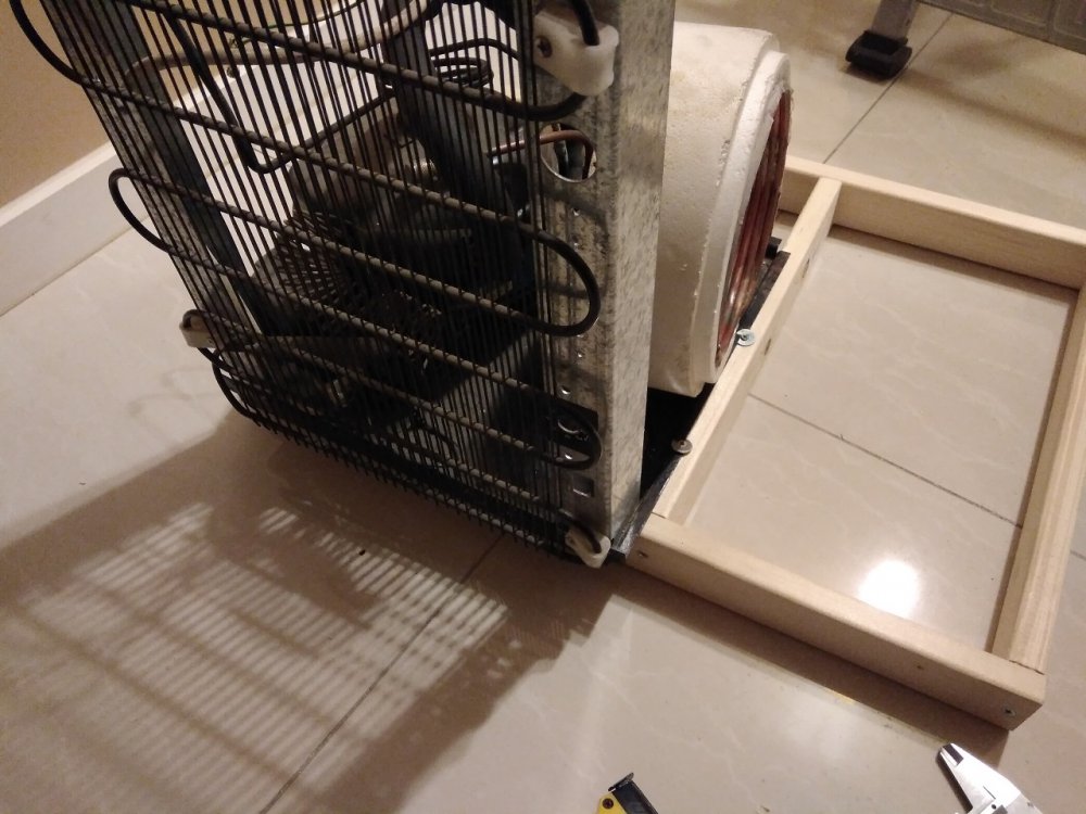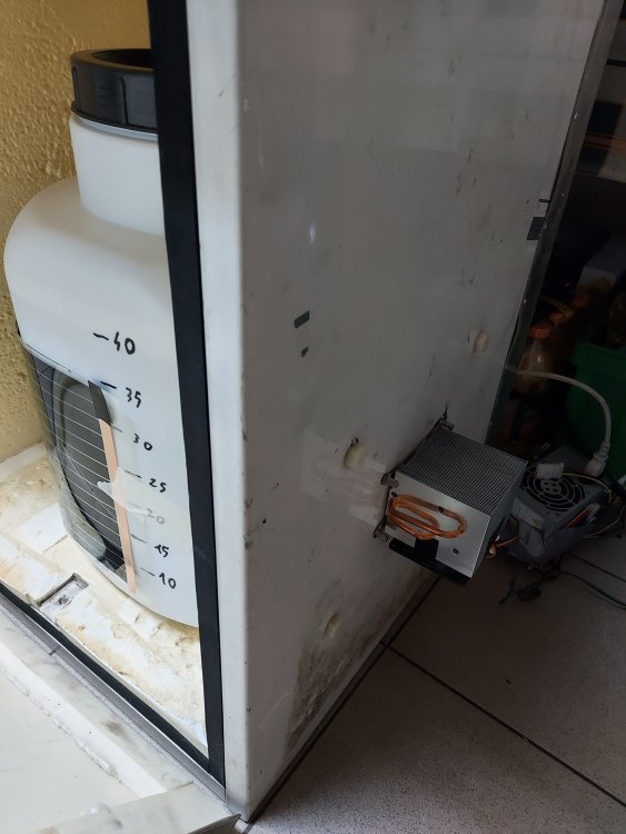 Cześć Jakiś czas temu wpadł w moje ręce używany dystrybutor wody. Taki jaki można spotkać w biurach czy też miejscach użyteczności publicznej. Prezentuje się tak: Na drugim zdjęciu widać zamontowany agregat. Nie jest to urządzenie zbyt ciche nie jest też energooszczędne (klasa N). Klasa wynika ze sposobu chłodzenia. Mocny sprzęt chłodzi kilku litrowy kielich z wodą. Zaizolowane jest to cienkim styropianem. Pomyślałem, że muszę to przerobić na komorę fermentacyjną (skąd była inspiracja, to na dole wpisu). Po zdjęciu obudowy w górnej części widać kielich/michę z wodą. Dookoła tej michy nawinięta jest rurka miedziana. Jest to parownik układu chłodniczego. To on odbiera energię/ciepło. Ten brązowy dzbanek na dole to grzałka i pojemnik na ciepłą wodę. Grzałka jest przepalona, ale nie mam zamiaru jej używać. Zdemontowałem wszystko oprócz układu chłodniczego, delikatnie przegiąłem parownik na bok. Chciałem aby urządzenie było kompaktowe i cały układ chłodzenia był zamontowany w podstawie komory fermentacyjnej. Jeszcze nie widziałem jak bardzo źle zrobiłem. Czas na test, jest całkiem fajnie. Po kilku minutach temperatura osiągnęła -20°C. Będę chciał tam zamontować wiatrak, aby wymusić obieg powietrza. Naszkicowałem wygląd komory (będzie stała w kącie i mam tam bardzo ograniczoną ilość miejsca: 48 cm x 60 cm x 80 cm). Nie udało mi się kupić lodówki w takim wymiarze, która by zmieściła wiadro. Stąd pomysł zrobienie własnej komory. Jako pierwszy krok podstawa. Będzie podobnie jak w szawkach kuchennych schowana na 4-5 cm. Fajna rzecz użytkowa, można podejść bliżej. Ma to znaczenie jak podnosi się pełen fermentor, bo planuję zwykłą nakładaną klapę. Sterownik STC-1000 będzie sercem lodówki. Chciałem go mieć zamontowanego w podstawie. Po to by wszystkie elementy były blisko siebie i w łatwy sposób można było zdemontować w razie naprawy. Sprawne i doświadczone oko już pewnie zauważyło, że zrobiłem kolejny błąd. Powinienem zamontować go niżej, bo na podstawie będzie skrzynia i przez to będzie utrudniony dostęp do przycisków. Ale już po ptakach. Jako, że używam tylko narzędzi ręcznych, to nierówne cięcia maskuję listwami aluminiowymi. Czas na pierwsze testy i podłączenie. Przeżyłem pierwsze chwile grozy, bo po podłączeniu elektryki agregat się nie włączał. O dziwo grzanie tak. Winny był sterownik. Miał zepsuty przekaźnik. Na szczęście mam dwa na stanie, więc wielkiej biedy nie było. Zepsuty przekaźnik też już wymieniłem. Czas na cięcie styropianu. Chciałem to zrobić ostrym nożem introligatorskim. Ani to było równo ani czysto. Po pierwszym cięciu drobiny styropianu były wszędzie. Mocno to diablestwo naelektryzowane. Koty w styropianie, ściany w styropianie ogólnie styropianowy armagedon. Trzeba było zapytać wujka Google jak podejść do sprawy. Rozwiązanie wygląda tak jak na poniższym zdjęciu W sklepie budowlanym kupiłem skleję (mają takie fajne skrzynie z odpadami po cięciu. W nich takie elementy są bardzo tanie) i drut oporowy, to on będzie częścią roboczą. Prąd go rozgrzeje do takiej temperatur, że styropian z łatwością się podda. Reszta to przewody i kawałek listwy aluminiowej. Źródło napięcia to zasilacz z mojego mieszadła z kadzi warzelno/zaciernej. Jest regulowany zatem nawet nie liczyłem oporów, po prostu ustawiłem najmniejsze napięcie, by uzyskać odpowiednią temperaturę. Zasilacz ma dużą obciążalność prądową i dał bez problemu radę. Trochę czasu upłynęło, zanim nauczyłem się tym ciąć i odpowiednio mocno naciągnąłem drut oporowy,. Możesz to zobaczyć na pierwszej linii cięcia. Po prostu fale Dunaju. Nie jest źle, i tak będę pianką uszczelniał. Tutaj tego nie widać, ale w parowniku jest zamontowany niskoobrotowy wentylator ze starego zasilacza. Będzie wmuszał obieg powierza. Po zabudowaniu układu chłodniczego wygląda to już całkiem fajnie. To szare to podstawa na której będzie stał fermentor. Będę go stawiał bezpośrednio na czujniku. Biały kabel to wyprowadzone napięcie do pasa grzejnego. Jest też już ramka, na której będzie się opierała skrzynia. Te dziury w podstawie to wlot i wylot powietrza. Mniejsza z tyłu to wlot, szeroka to nawiew zimnego powietrza. Jeszcze nie wiedziałem jak się bardzo myliłem :). Skrzynię zrobiłem z paneli podłogowych kupionych na promocji. Cenię miały małą, ale też były w kiepskim stanie. Koniec końców z dwóch paczek udało się coś wybrać. Ponownie, długie i nierówne ręczne cięcia maskowałem ceownikiem aluminiowym. Przytwierdzałem go na klej montażowy. Czas na styropian. Wyszło nawet równo. Małe szczeliny będę zalepiał pianką. Na plecy użyłem styroduru 3 cm. Ze względu na to, że musiałem uzyskać 38 cm, by wlazło wiadro. Styrodur o takiej grubości ma właściwości termiczne blisko dwukrotnie grubszego styropianu. Niestety też jest drogi. Jedna płyta ~0,6m2 kosztuje prawie 20 zł. Teraz wygląda to tak: Klapa jest nakładana na górę. Jest ciężka i szczelnie dociska styrodur doklejony do niej. Brakuje jeszcze listw maskujących i takich nasadek na śrubki. Ale zaczyna już to wyglądać. Jak się przyjrzysz to lustro i ściana jest jeszcze w styropianie Czas na próbę. I jęk zawodu. Po kilku minutach pracy niemiłosierne bulgotanie w układzie chłodniczym. Działa, ale jest strasznie głośno. Po rozmowie z wujkiem Google okazało się, że parownik powinien być zamontowany nad kompresorem. Na szczęście robiłem tak, że dostęp do układu chłodniczego jest prosty. Skrzynia też jest wystarczająco szeroka by przenieś parownik na bok. Trzeba było rozmontować delikatnie przegiąć rurkę miedzianą, by parownik trafił na boczną ściankę oraz jakoś to zamocować. Nie miałem większego pomysłu zatem użyłem pianki i resztki styroduru. Nawet wyszło lepiej, bo p