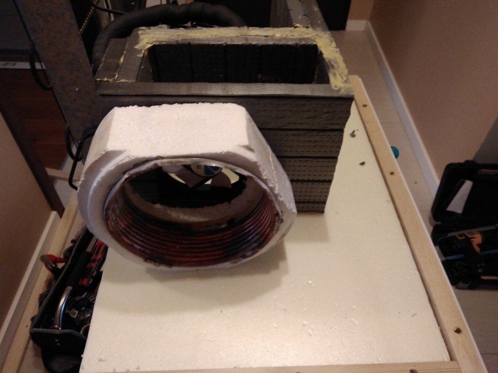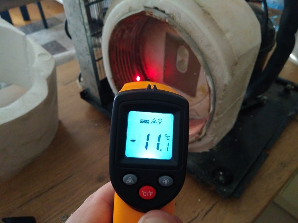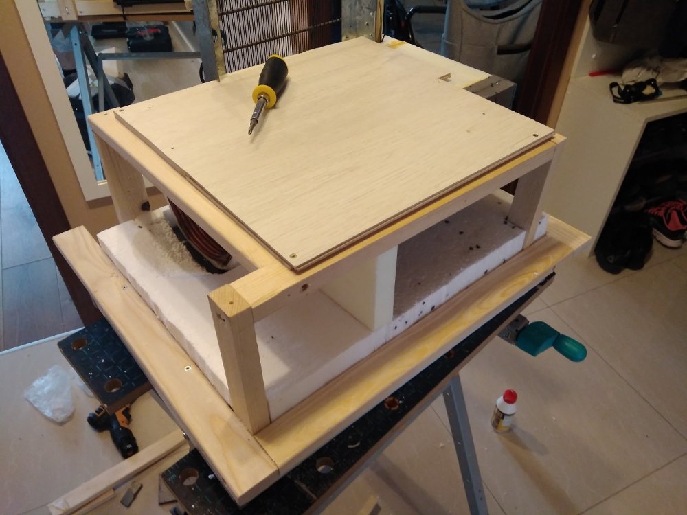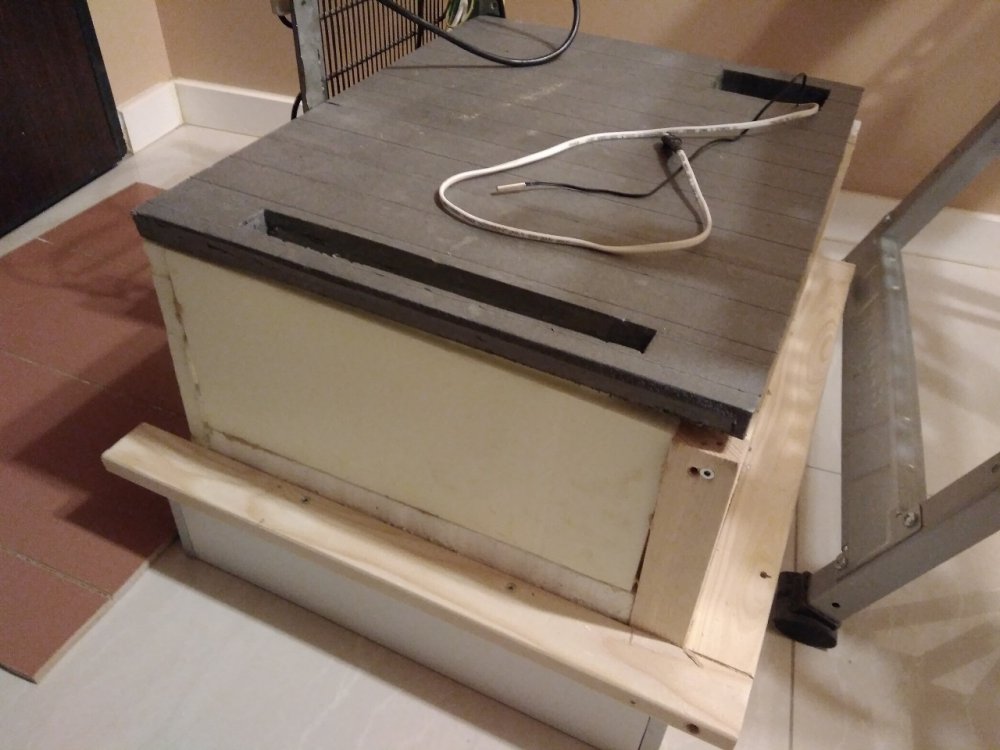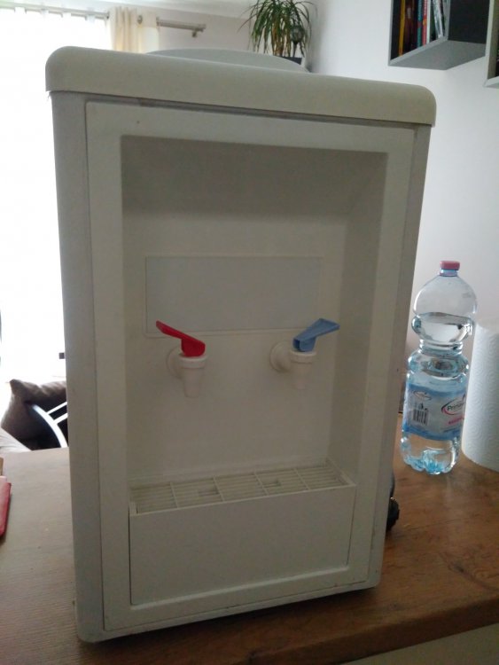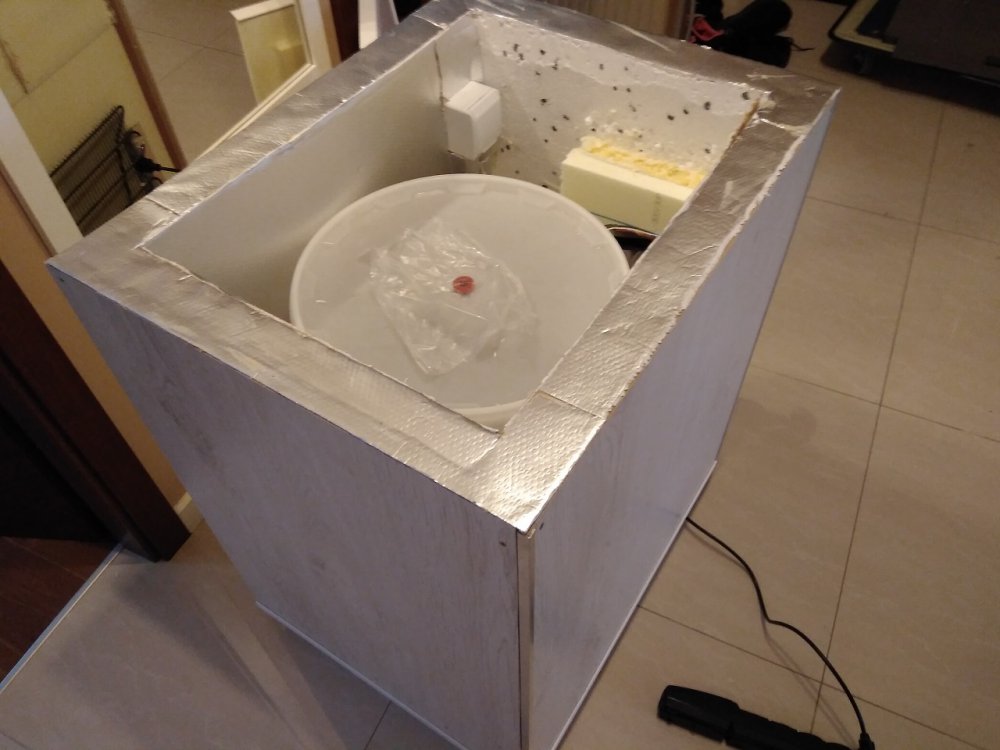 Cześć Jakiś czas temu wpadł w moje ręce używany dystrybutor wody. Taki jaki można spotkać w biurach czy też miejscach użyteczności publicznej. Prezentuje się tak: Na drugim zdjęciu widać zamontowany agregat. Nie jest to urządzenie zbyt ciche nie jest też energooszczędne (klasa N). Klasa wynika ze sposobu chłodzenia. Mocny sprzęt chłodzi kilku litrowy kielich z wodą. Zaizolowane jest to cienkim styropianem. Pomyślałem, że muszę to przerobić na komorę fermentacyjną (skąd była inspiracja, to na dole wpisu). Po zdjęciu obudowy w górnej części widać kielich/michę z wodą. Dookoła tej michy nawinięta jest rurka miedziana. Jest to parownik układu chłodniczego. To on odbiera energię/ciepło. Ten brązowy dzbanek na dole to grzałka i pojemnik na ciepłą wodę. Grzałka jest przepalona, ale nie mam zamiaru jej używać. Zdemontowałem wszystko oprócz układu chłodniczego, delikatnie przegiąłem parownik na bok. Chciałem aby urządzenie było kompaktowe i cały układ chłodzenia był zamontowany w podstawie komory fermentacyjnej. Jeszcze nie widziałem jak bardzo źle zrobiłem. Czas na test, jest całkiem fajnie. Po kilku minutach temperatura osiągnęła -20°C. Będę chciał tam zamontować wiatrak, aby wymusić obieg powietrza. Naszkicowałem wygląd komory (będzie stała w kącie i mam tam bardzo ograniczoną ilość miejsca: 48 cm x 60 cm x 80 cm). Nie udało mi się kupić lodówki w takim wymiarze, która by zmieściła wiadro. Stąd pomysł zrobienie własnej komory. Jako pierwszy krok podstawa. Będzie podobnie jak w szawkach kuchennych schowana na 4-5 cm. Fajna rzecz użytkowa, można podejść bliżej. Ma to znaczenie jak podnosi się pełen fermentor, bo planuję zwykłą nakładaną klapę. Sterownik STC-1000 będzie sercem lodówki. Chciałem go mieć zamontowanego w podstawie. Po to by wszystkie elementy były blisko siebie i w łatwy sposób można było zdemontować w razie naprawy. Sprawne i doświadczone oko już pewnie zauważyło, że zrobiłem kolejny błąd. Powinienem zamontować go niżej, bo na podstawie będzie skrzynia i przez to będzie utrudniony dostęp do przycisków. Ale już po ptakach. Jako, że używam tylko narzędzi ręcznych, to nierówne cięcia maskuję listwami aluminiowymi. Czas na pierwsze testy i podłączenie. Przeżyłem pierwsze chwile grozy, bo po podłączeniu elektryki agregat się nie włączał. O dziwo grzanie tak. Winny był sterownik. Miał zepsuty przekaźnik. Na szczęście mam dwa na stanie, więc wielkiej biedy nie było. Zepsuty przekaźnik też już wymieniłem. Czas na cięcie styropianu. Chciałem to zrobić ostrym nożem introligatorskim. Ani to było równo ani czysto. Po pierwszym cięciu drobiny styropianu były wszędzie. Mocno to diablestwo naelektryzowane. Koty w styropianie, ściany w styropianie ogólnie styropianowy armagedon. Trzeba było zapytać wujka Google jak podejść do sprawy. Rozwiązanie wygląda tak jak na poniższym zdjęciu W sklepie budowlanym kupiłem skleję (mają takie fajne skrzynie z odpadami po cięciu. W nich takie elementy są bardzo tanie) i drut oporowy, to on będzie częścią roboczą. Prąd go rozgrzeje do takiej temperatur, że styropian z łatwością się podda. Reszta to przewody i kawałek listwy aluminiowej. Źródło napięcia to zasilacz z mojego mieszadła z kadzi warzelno/zaciernej. Jest regulowany zatem nawet nie liczyłem oporów, po prostu ustawiłem najmniejsze napięcie, by uzyskać odpowiednią temperaturę. Zasilacz ma dużą obciążalność prądową i dał bez problemu radę. Trochę czasu upłynęło, zanim nauczyłem się tym ciąć i odpowiednio mocno naciągnąłem drut oporowy,. Możesz to zobaczyć na pierwszej linii cięcia. Po prostu fale Dunaju. Nie jest źle, i tak będę pianką uszczelniał. Tutaj tego nie widać, ale w parowniku jest zamontowany niskoobrotowy wentylator ze starego zasilacza. Będzie wmuszał obieg powierza. Po zabudowaniu układu chłodniczego wygląda to już całkiem fajnie. To szare to podstawa na której będzie stał fermentor. Będę go stawiał bezpośrednio na czujniku. Biały kabel to wyprowadzone napięcie do pasa grzejnego. Jest też już ramka, na której będzie się opierała skrzynia. Te dziury w podstawie to wlot i wylot powietrza. Mniejsza z tyłu to wlot, szeroka to nawiew zimnego powietrza. Jeszcze nie wiedziałem jak się bardzo myliłem :). Skrzynię zrobiłem z paneli podłogowych kupionych na promocji. Cenię miały małą, ale też były w kiepskim stanie. Koniec końców z dwóch paczek udało się coś wybrać. Ponownie, długie i nierówne ręczne cięcia maskowałem ceownikiem aluminiowym. Przytwierdzałem go na klej montażowy. Czas na styropian. Wyszło nawet równo. Małe szczeliny będę zalepiał pianką. Na plecy użyłem styroduru 3 cm. Ze względu na to, że musiałem uzyskać 38 cm, by wlazło wiadro. Styrodur o takiej grubości ma właściwości termiczne blisko dwukrotnie grubszego styropianu. Niestety też jest drogi. Jedna płyta ~0,6m2 kosztuje prawie 20 zł. Teraz wygląda to tak: Klapa jest nakładana na górę. Jest ciężka i szczelnie dociska styrodur doklejony do niej. Brakuje jeszcze listw maskujących i takich nasadek na śrubki. Ale zaczyna już to wyglądać. Jak się przyjrzysz to lustro i ściana jest jeszcze w styropianie Czas na próbę. I jęk zawodu. Po kilku minutach pracy niemiłosierne bulgotanie w układzie chłodniczym. Działa, ale jest strasznie głośno. Po rozmowie z wujkiem Google okazało się, że parownik powinien być zamontowany nad kompresorem. Na szczęście robiłem tak, że dostęp do układu chłodniczego jest prosty. Skrzynia też jest wystarczająco szeroka by przenieś parownik na bok. Trzeba było rozmontować delikatnie przegiąć rurkę miedzianą, by parownik trafił na boczną ściankę oraz jakoś to zamocować. Nie miałem większego pomysłu zatem użyłem pianki i resztki styroduru. Nawet wyszło lepiej, bo p