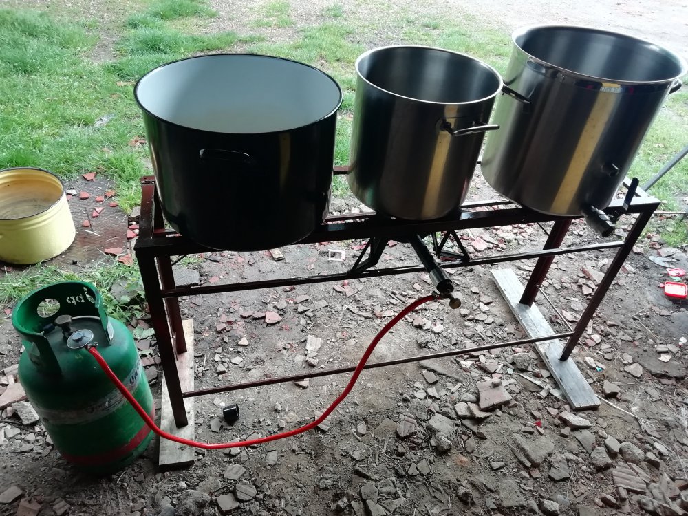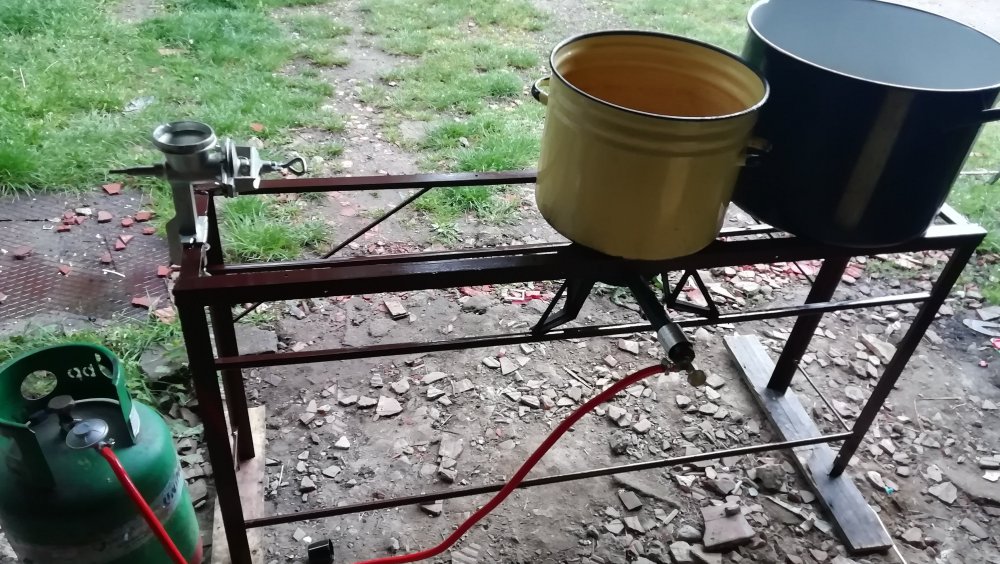 Witam. Chciałem się podzielić ,,moim" projektem na stół do warzenia piwa. Pomysł nie jest do końca mój, jest zaczerpnięty z internetu, tam wyglądało to nieco inaczej i bardziej profesjonalnie. Taboret był umieszczony chyba na jakiejś suwnicy na kółkach. Ja chciałem zrobić stojak podobny do Hermsa, ale podpatrzyłem to rozwiązanie i zrobiłem takie coś z tego co miałem pod ręką. Założenie jest takie, że trzy gary stoją w jednym miejscu, palnik jest umieszczony pod nimi na lekkich prętach. No i w zależności od tego czy zacieram, gotuję czy grzeję wodę do wysładzania to podsuwam palnik pod odpowiedni gar. Jeszcze tego nie testowałem. Jak przetestuję to opiszę. Do wykonania potrzeba kątowniki, pręty do stabilizacji i jakieś lekkie pręty na których będzie jeździł taboret. Ważne aby palnik ustawić tak, aby był tuż pod kątownikami, żeby nie tracić ciepła. Ja na początku zrobiłem sobie szybki projekt ze zbędnej sklejki. Pospawany z kątowników. Z naciętymi kątówką miejscami na suwnice. Zrobiłem możliwość regulacji wysokości, zawsze lepiej mieć opcję regulacji. Np w razie gdyby trzeba było zmienić taboret. Suwnice zrobiłem ze starego karnisza, fajny, bo lekki. Składa się ona z dwóch elementów także można je rozsuwać i zsuwać. W jednym boku jest wspawany dodatkowy kawałek płaskownika, żeby można było przykręcić śrutownik. Gotowy pomalowany z nową kadzią zacierną. Niedługo pierwsze testy w nowej warzelni. Będę edytował temat. W zasadzie pierwszy test już był. Gotowałem wodę z kwaskiem, aby wygotować chłodnicę. Woda zagotowała się normalnie. Garnek stoi może te 2-3 mm wyżej niż by stał na palniku. W razie czego można zawsze odkręcić nóżki od taboretu i podwiesić go wyżej.